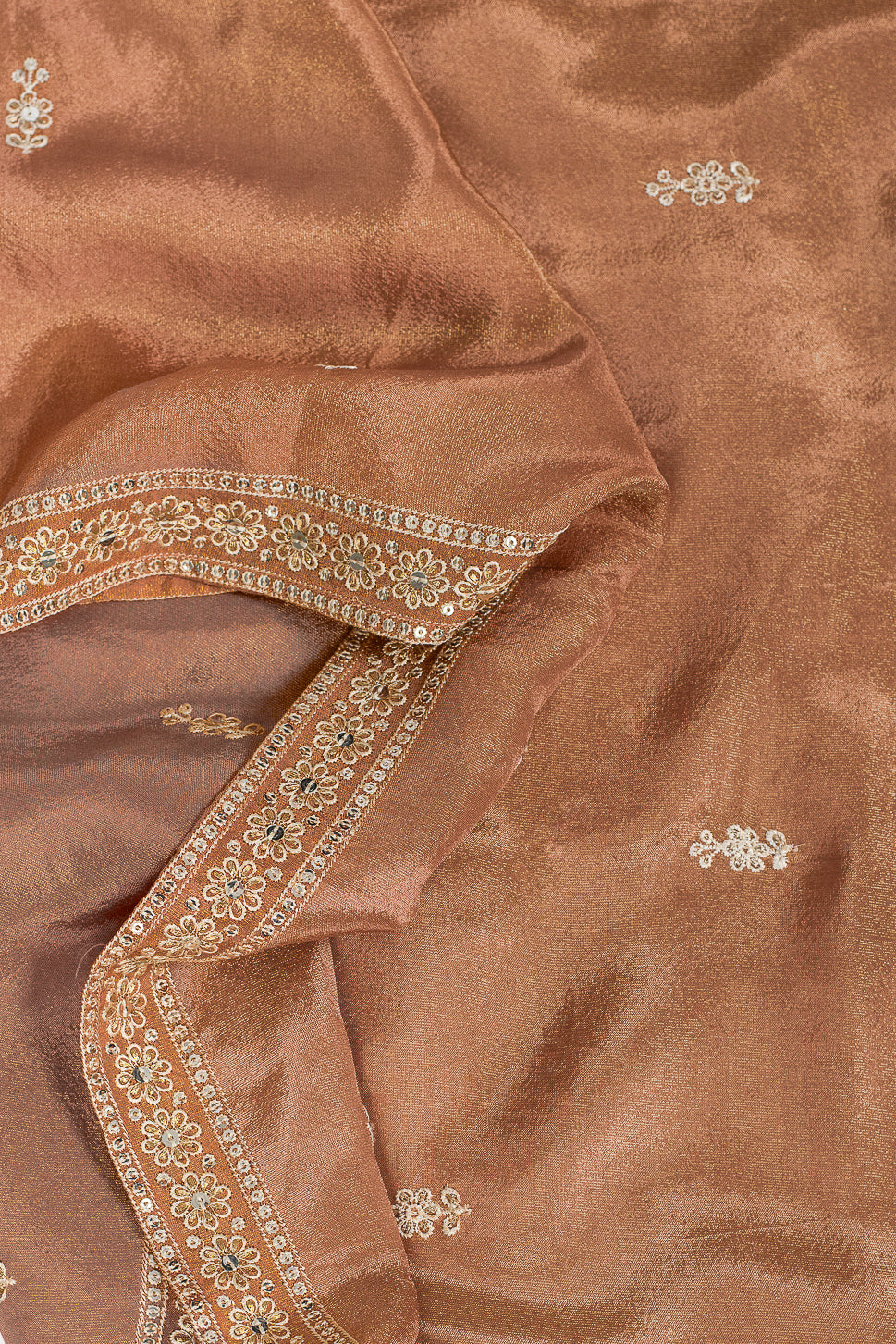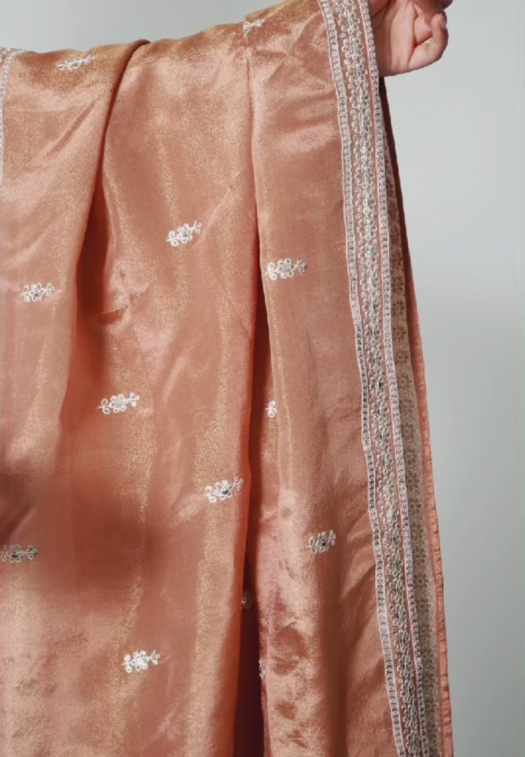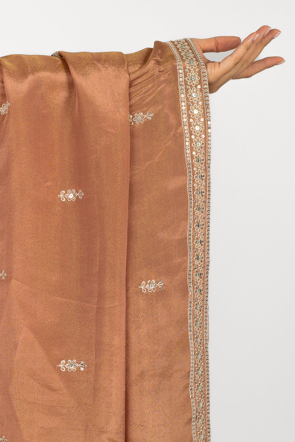 The Apricot Sheen Dupatta in a lustrous dupion silk features intricate threadwork and a graceful drape, adding a touch of timeless elegance to your look. The warm apricot orange tone adds a soft, radiant glow, capturing the essence of traditional elegance with a modern twist.