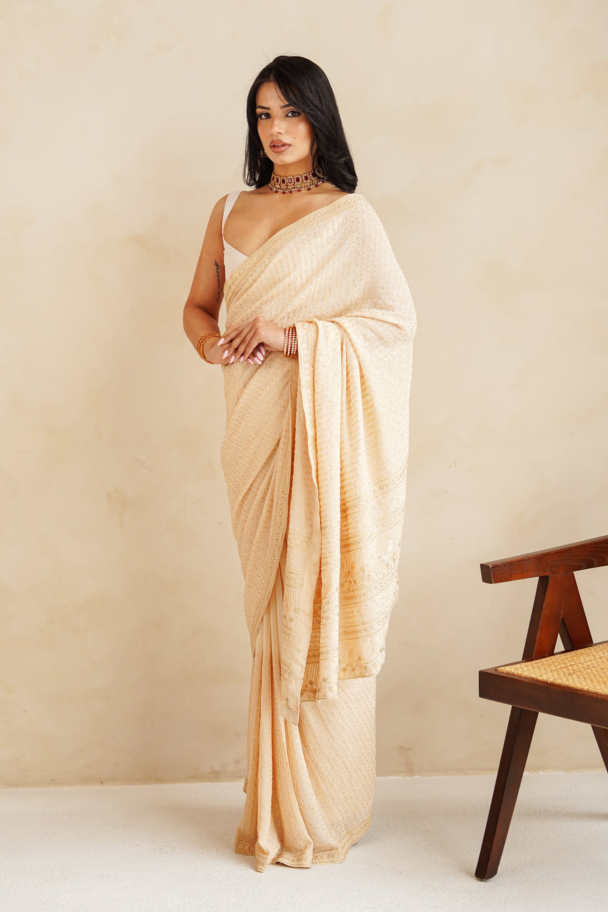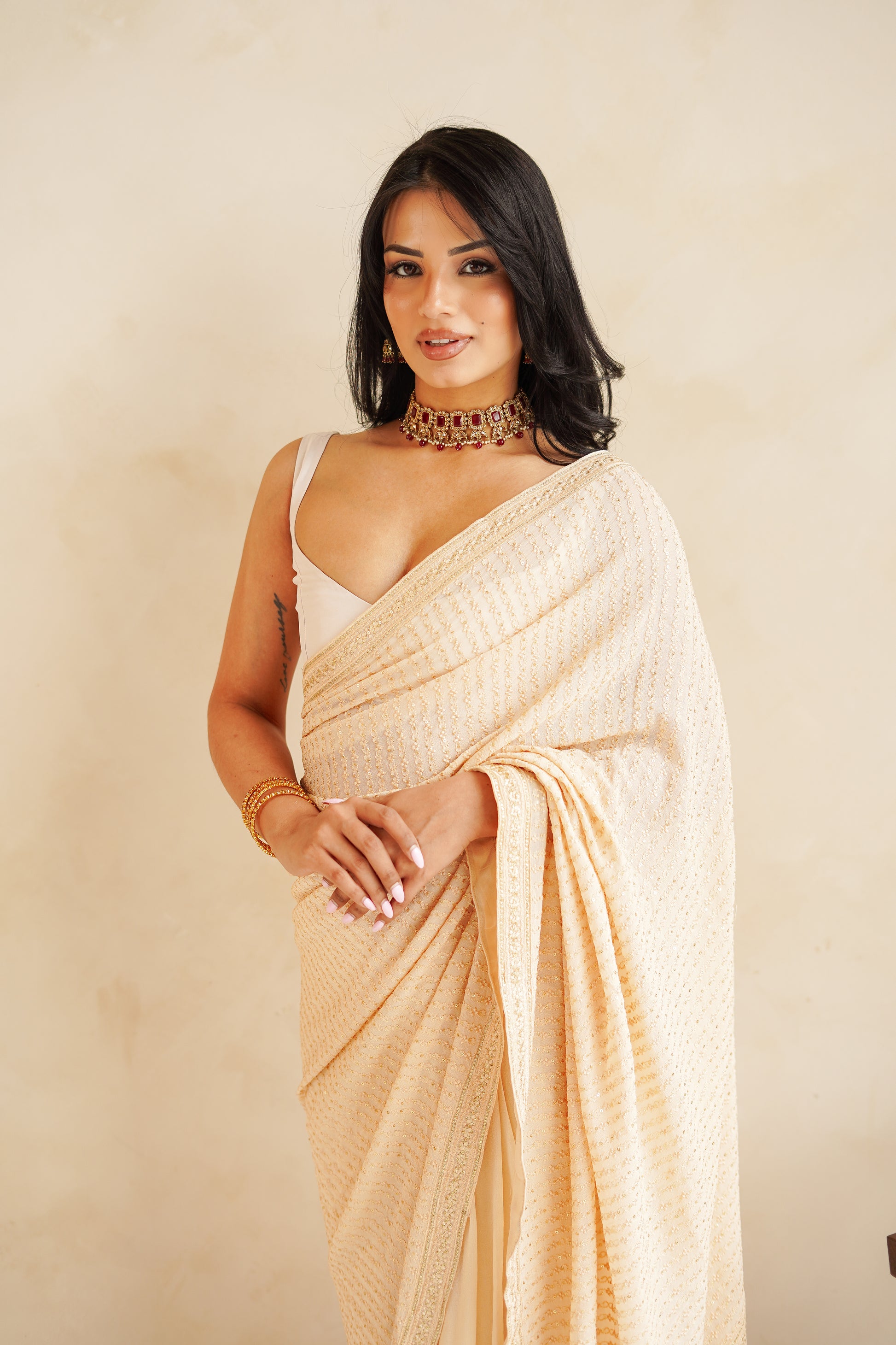 Grace meets effortless elegance in the Beige Cleo Easy-Drape Saree. Crafted from soft, flowy georgette, this saree drapes beautifully while ensuring all-day comfort. Delicate threadwork in a traditional pattern adds depth and artistry, while subtle gold sequin detailing lends a touch of shimmer. The warm beige hue enhances its understated sophistication, making it a timeless choice for celebrations and special occasions. We recommend pairing this with a micro blouse for a classic vintage look or a full-sleeve blouse for a traditional, modest aesthetic.