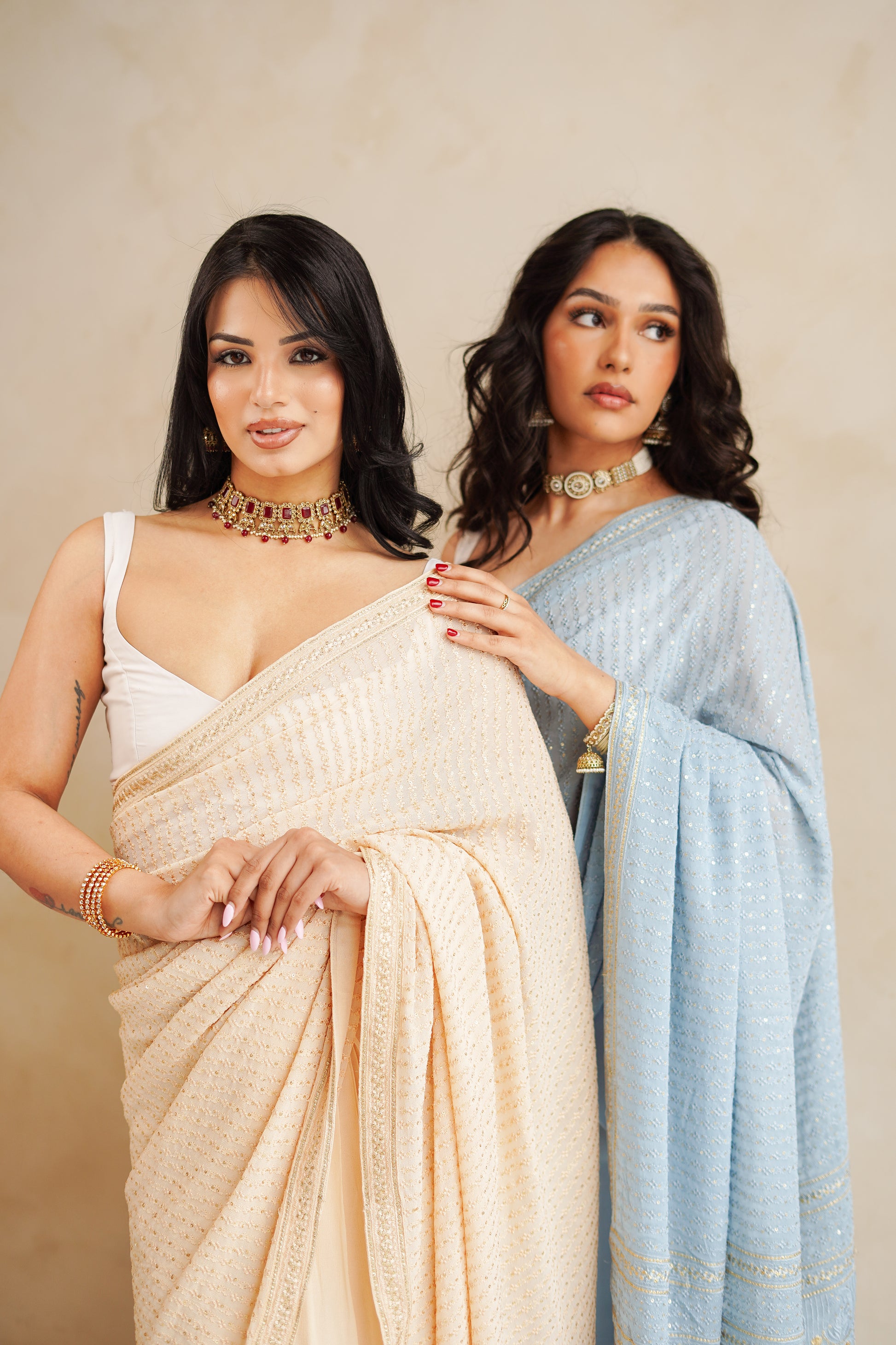 Pre-Pleated Saree. Georgette Fabric Composition. Threadwork and Sequins Embroidery.