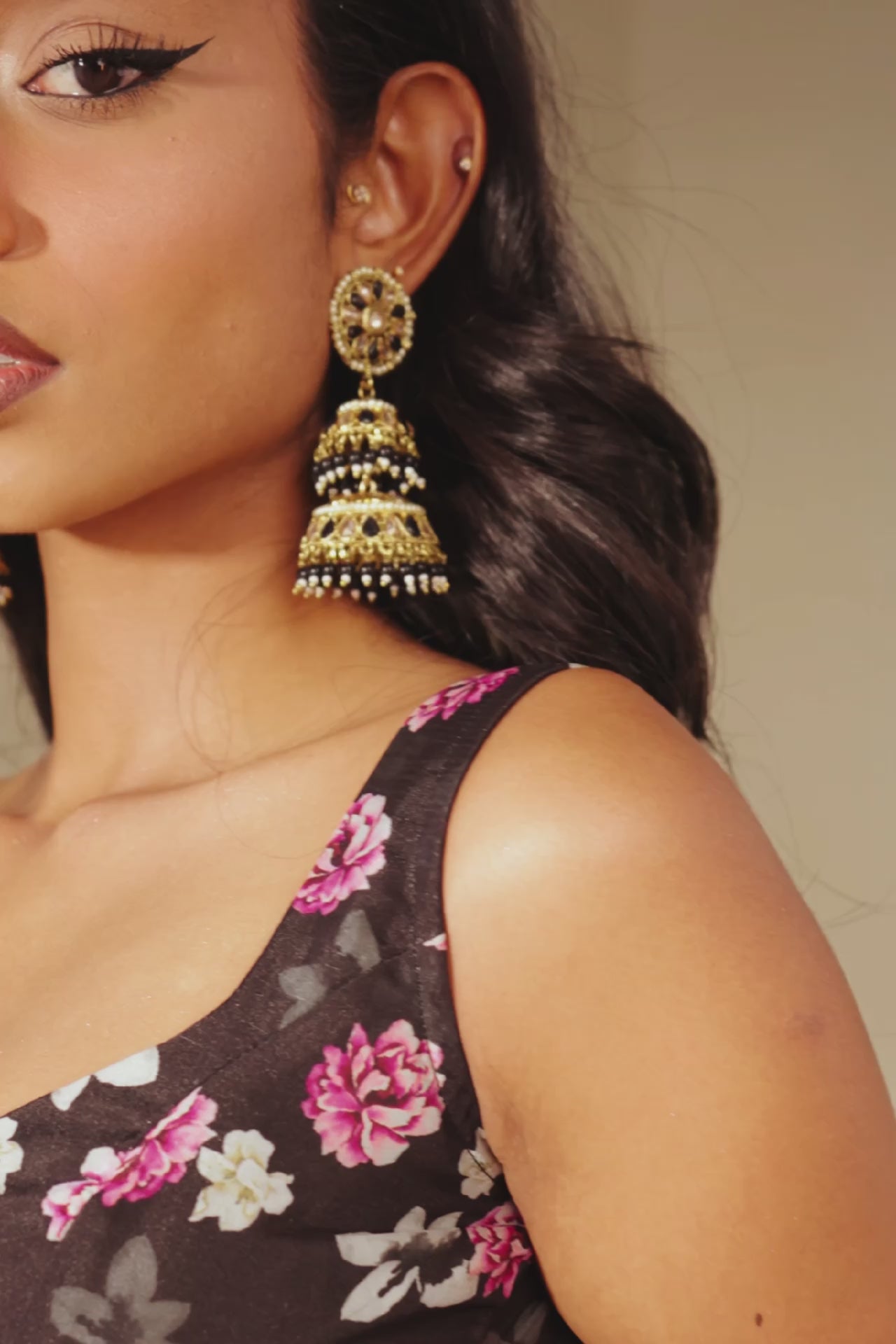 The Black Stacked Jhumkis are statement earrings. These earrings have a circle base with 2 chandelier tiers. We love the black & cream gem tones paired together. The length of the earrings are about 3.5". These earrings are meant for pierced ears.