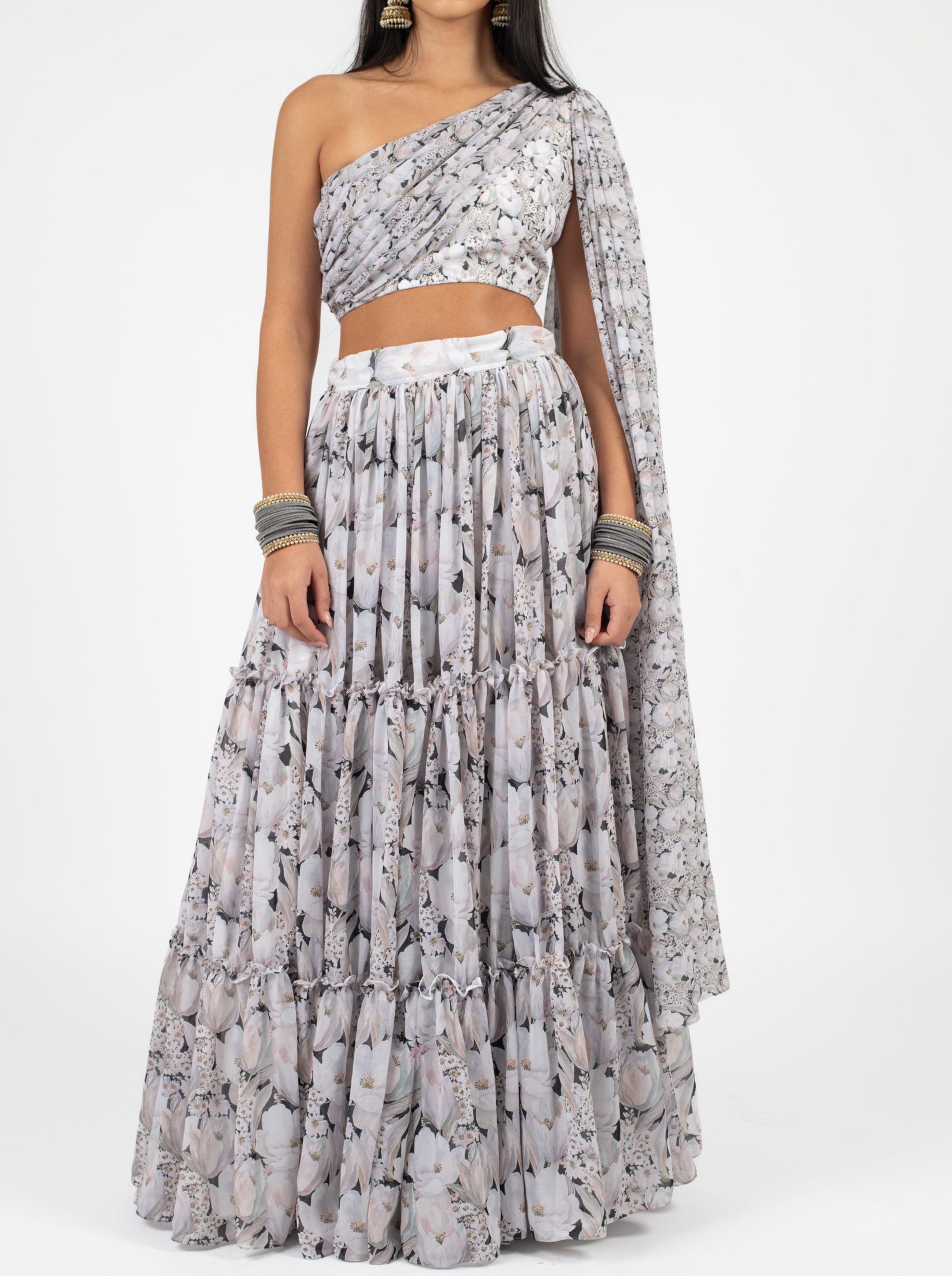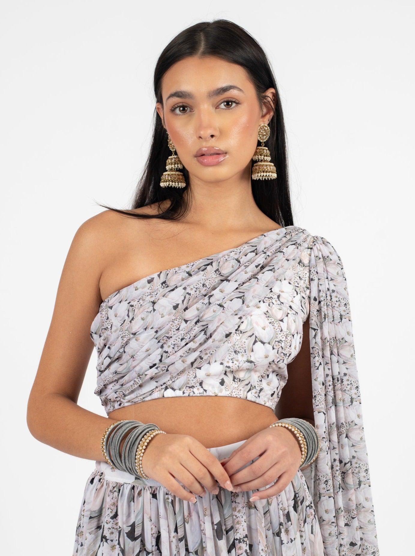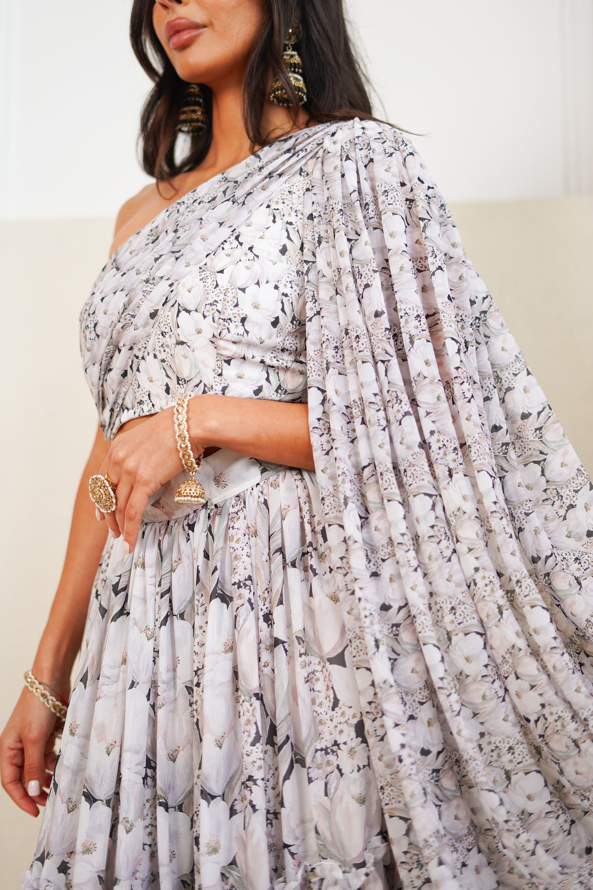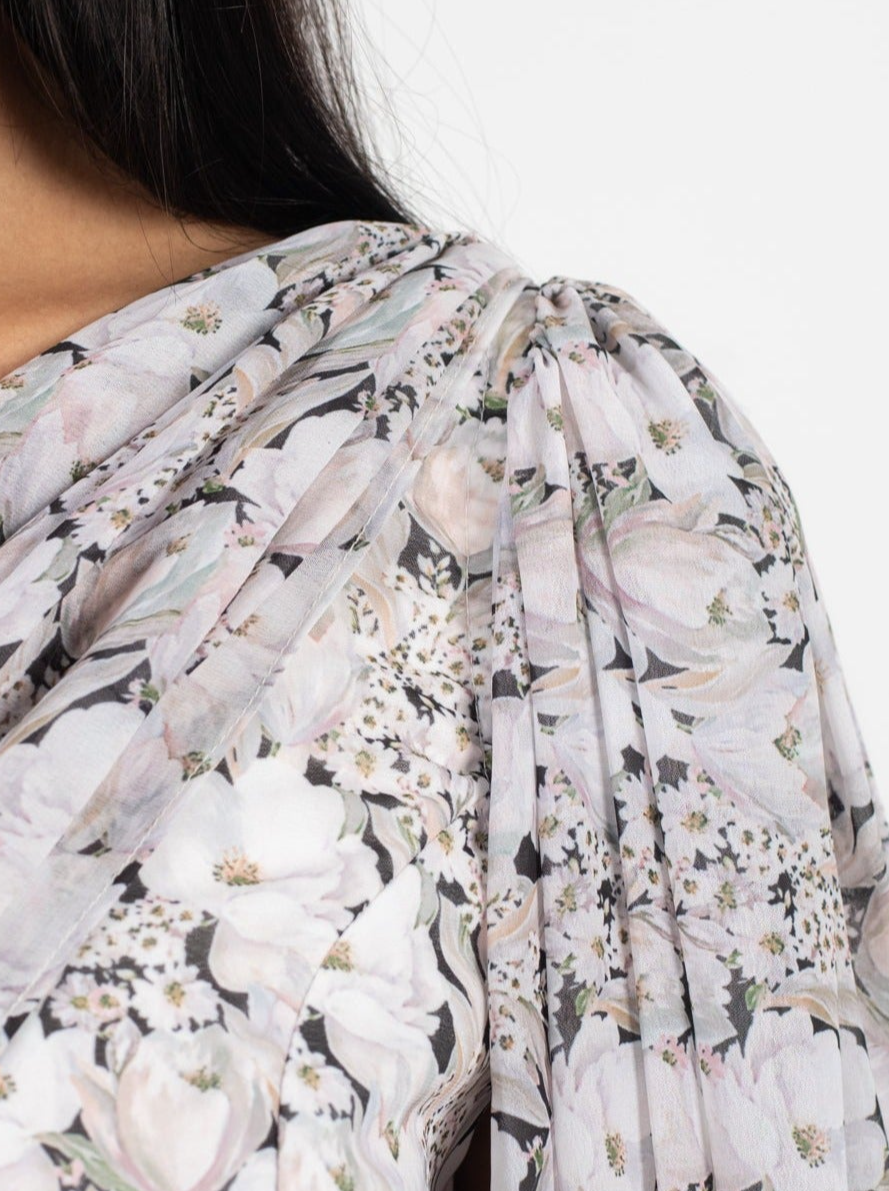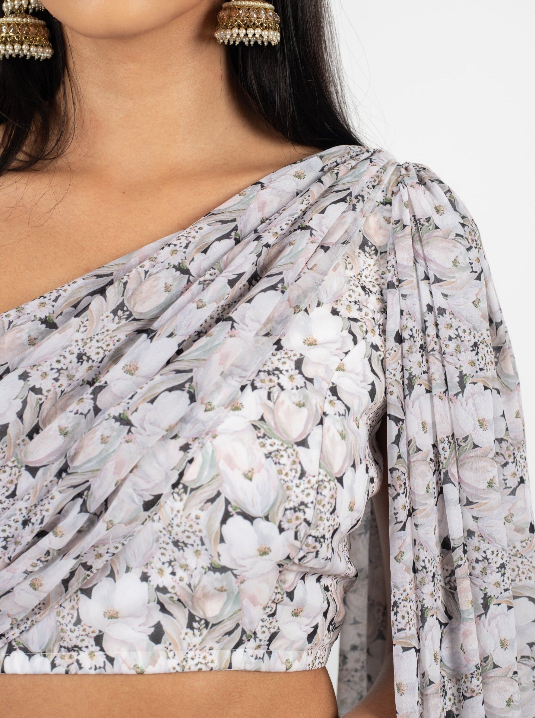 Introducing The Casa Blanca Blouse, crafted from a luxurious georgette fabric with gathered pleats for a flowing silhouette. The floral pattern consists of a palette of black, white, and soft pink hues. Featuring a unique built-in dupatta-sleeve and one shoulder design, this blouse combines modern elegance with trendy fashion. Perfect for occasions where effortless style is essential, it ensures comfort and grace without the need for additional accessories.