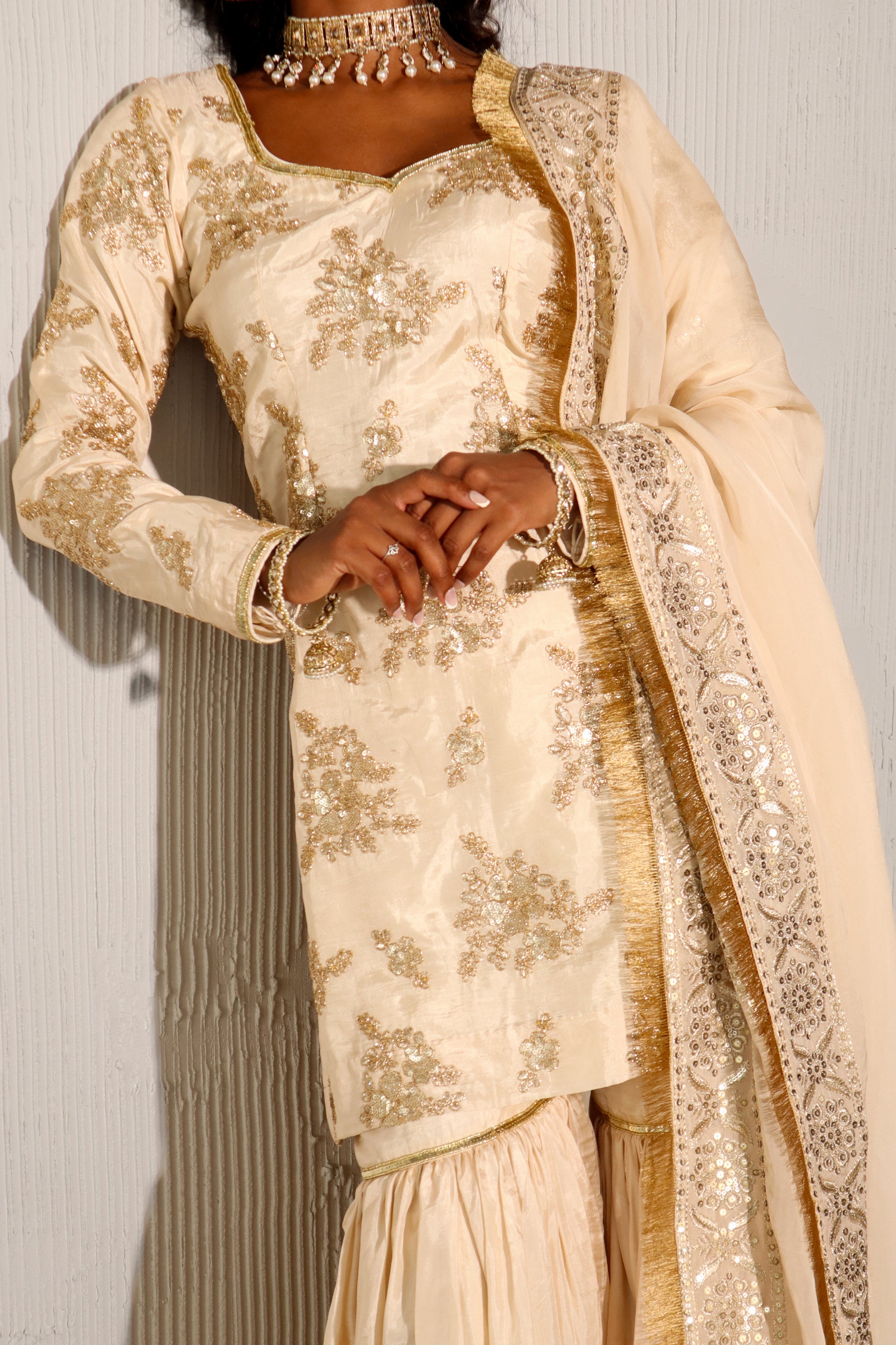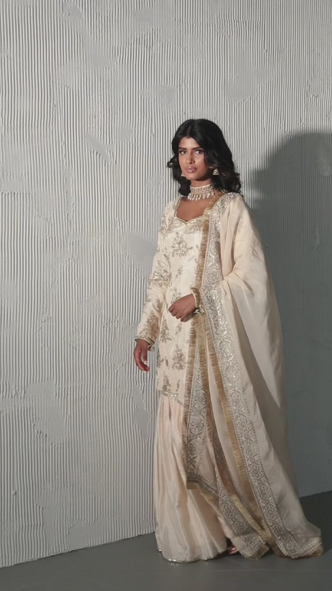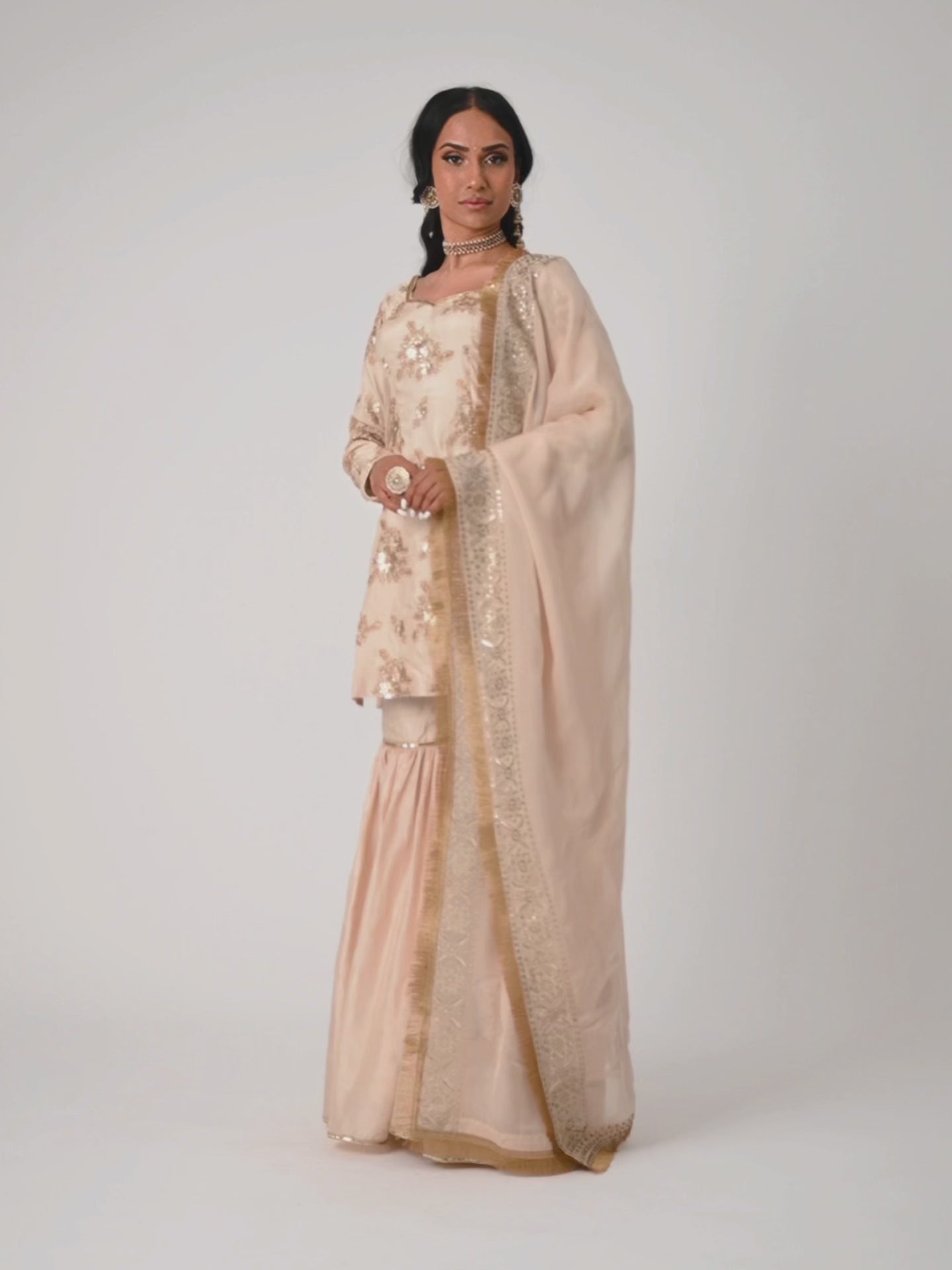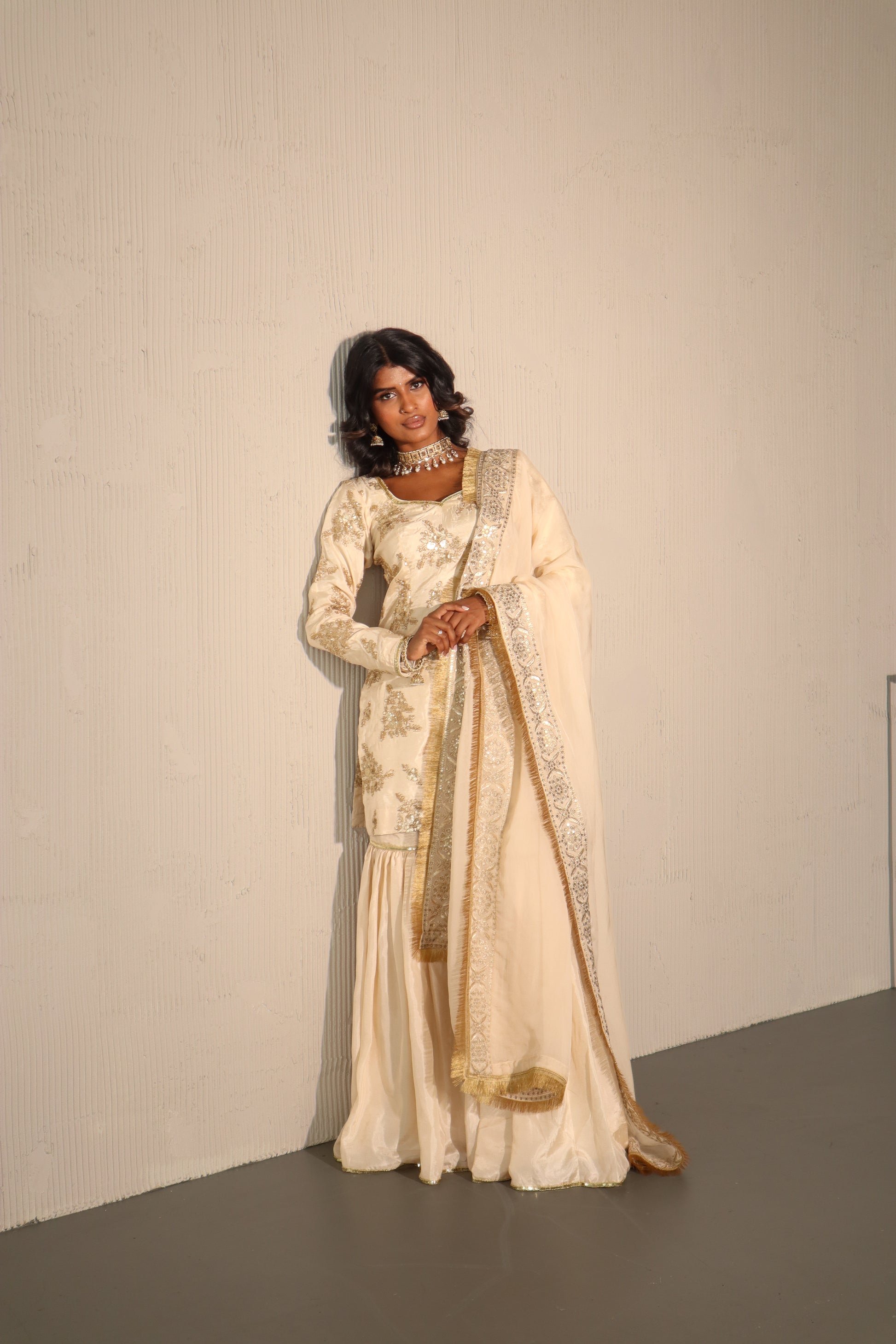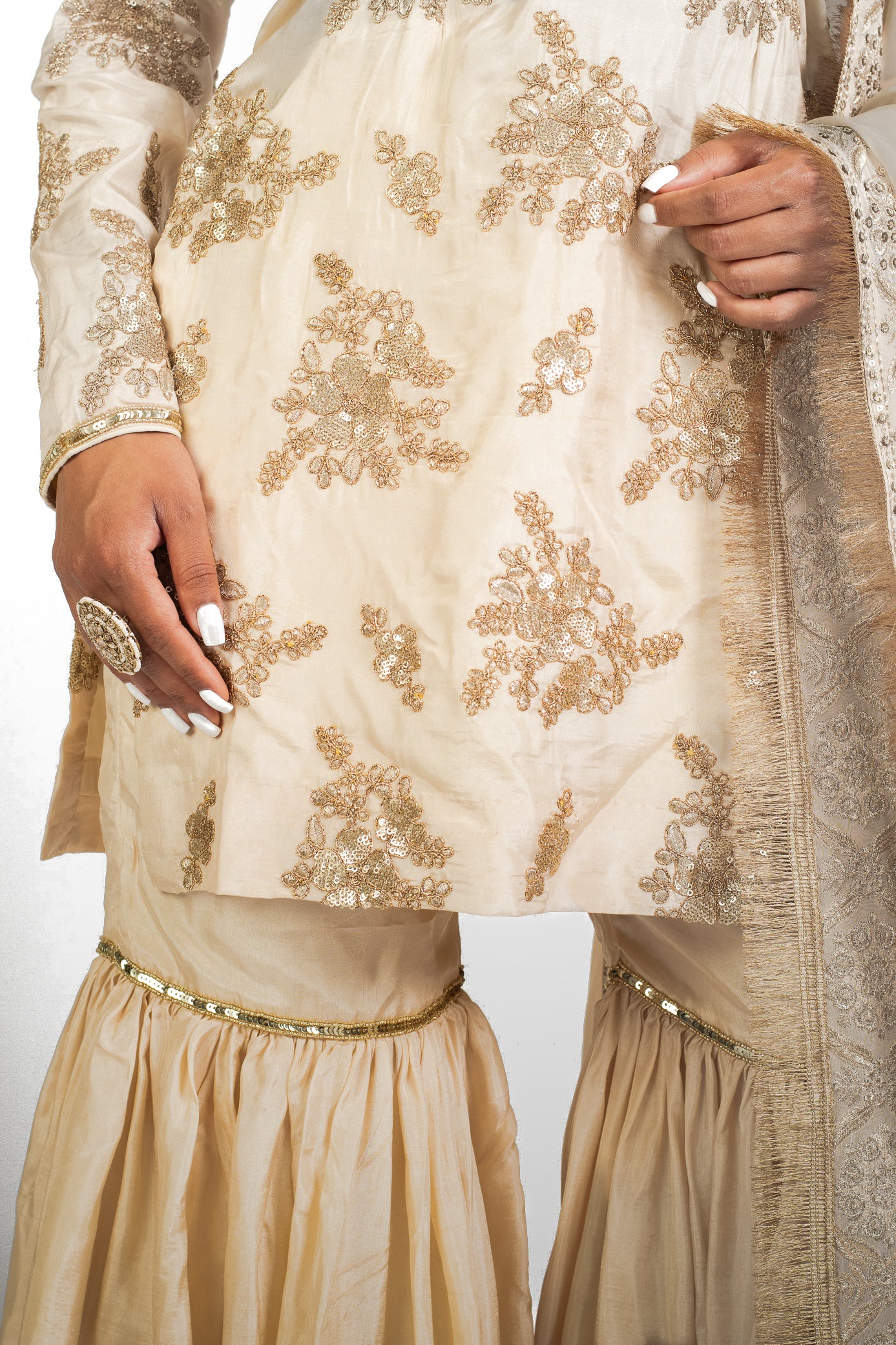 Gharara. Opara Silk Composition. Threadwork and Sequins Embroidery. Floral Pattern Detailing. Dupatta Included.