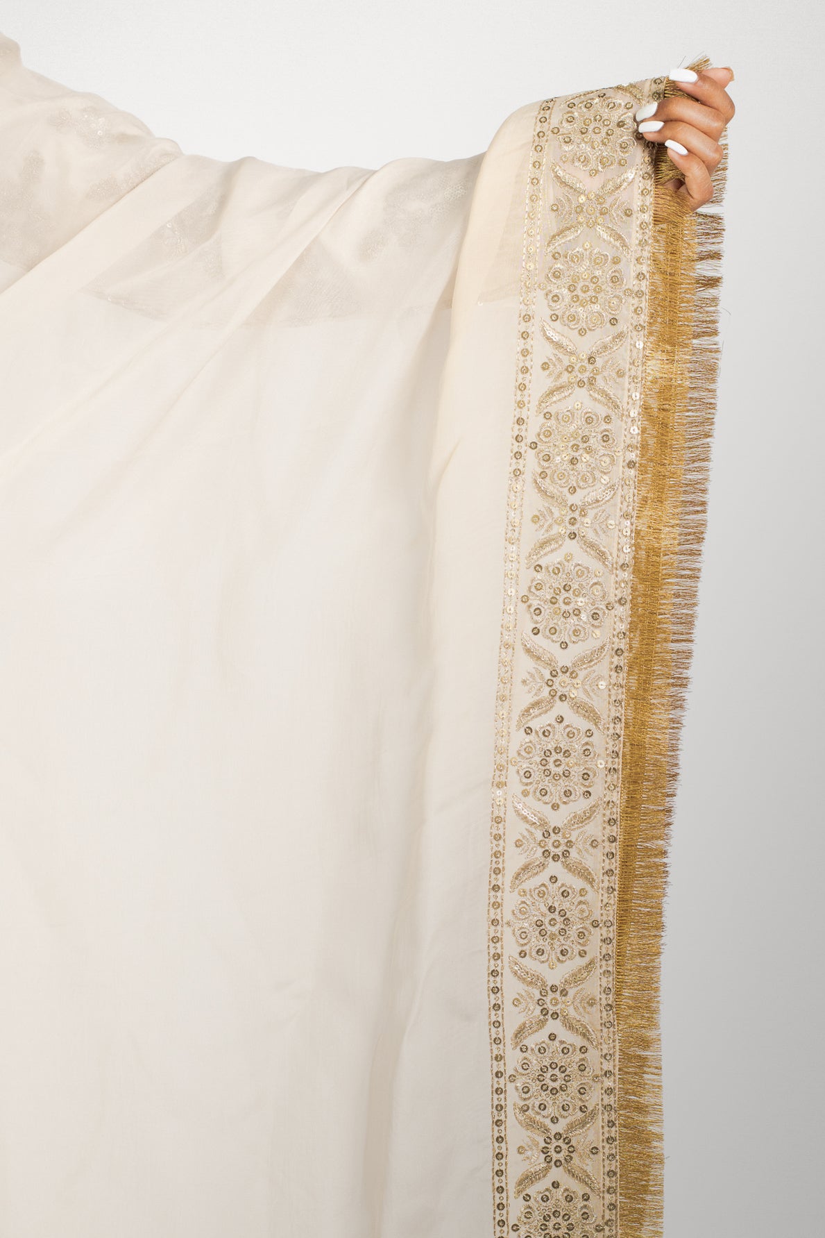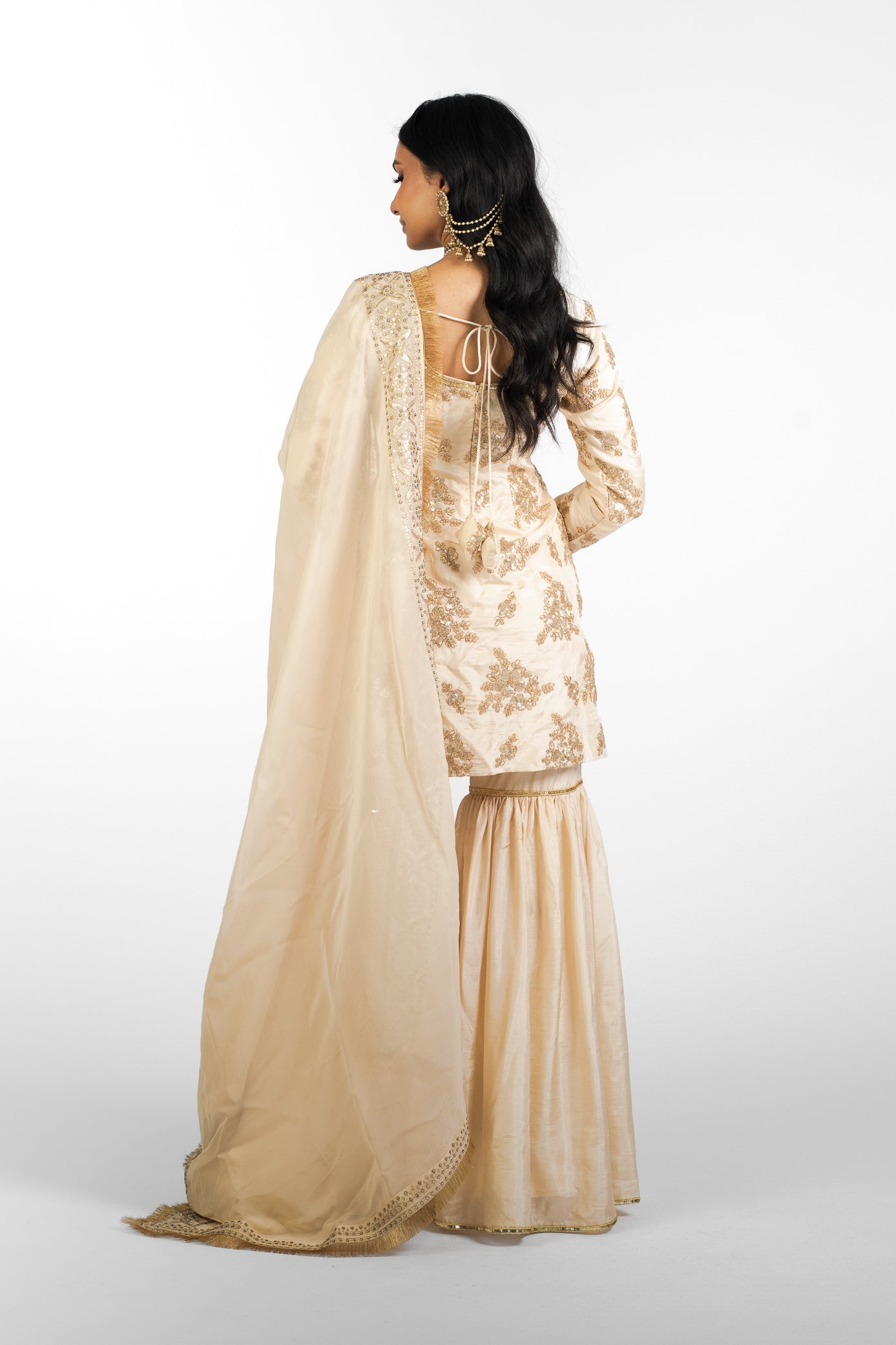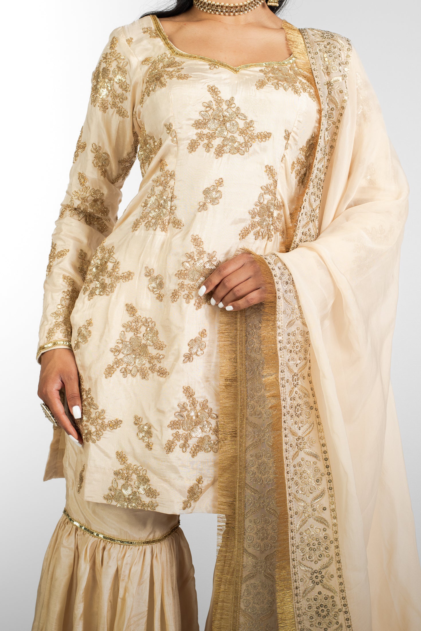 Introducing our Champagne Ryna Suit, a timeless masterpiece that effortlessly blends classical, traditional style with modern culture. Adorned with a captivating floral threadwork pattern, this suit is guaranteed to turn heads wherever you go. Crafted from a luxurious opara silk fabric, it exudes comfort and elegance. The sequins trims delicately embellish the suit and enhance its allure. Completing the look is a georgette dupatta with a fringe border, adding a graceful finishing touch. Elevate your fashion with the Champagne Ryna Suit, where tradition meets contemporary sophistication.
