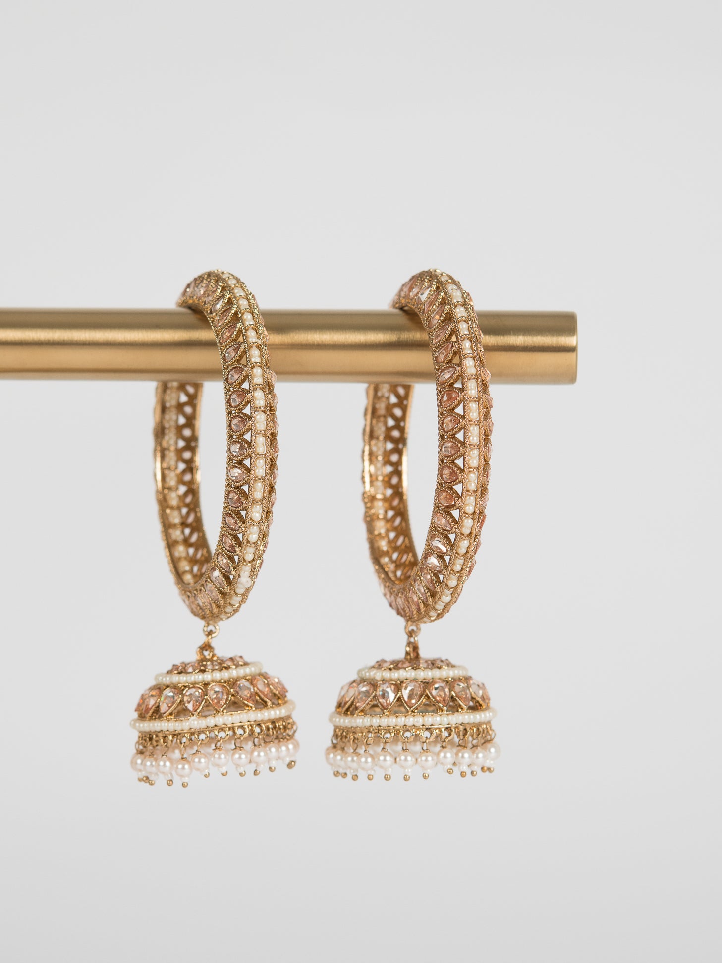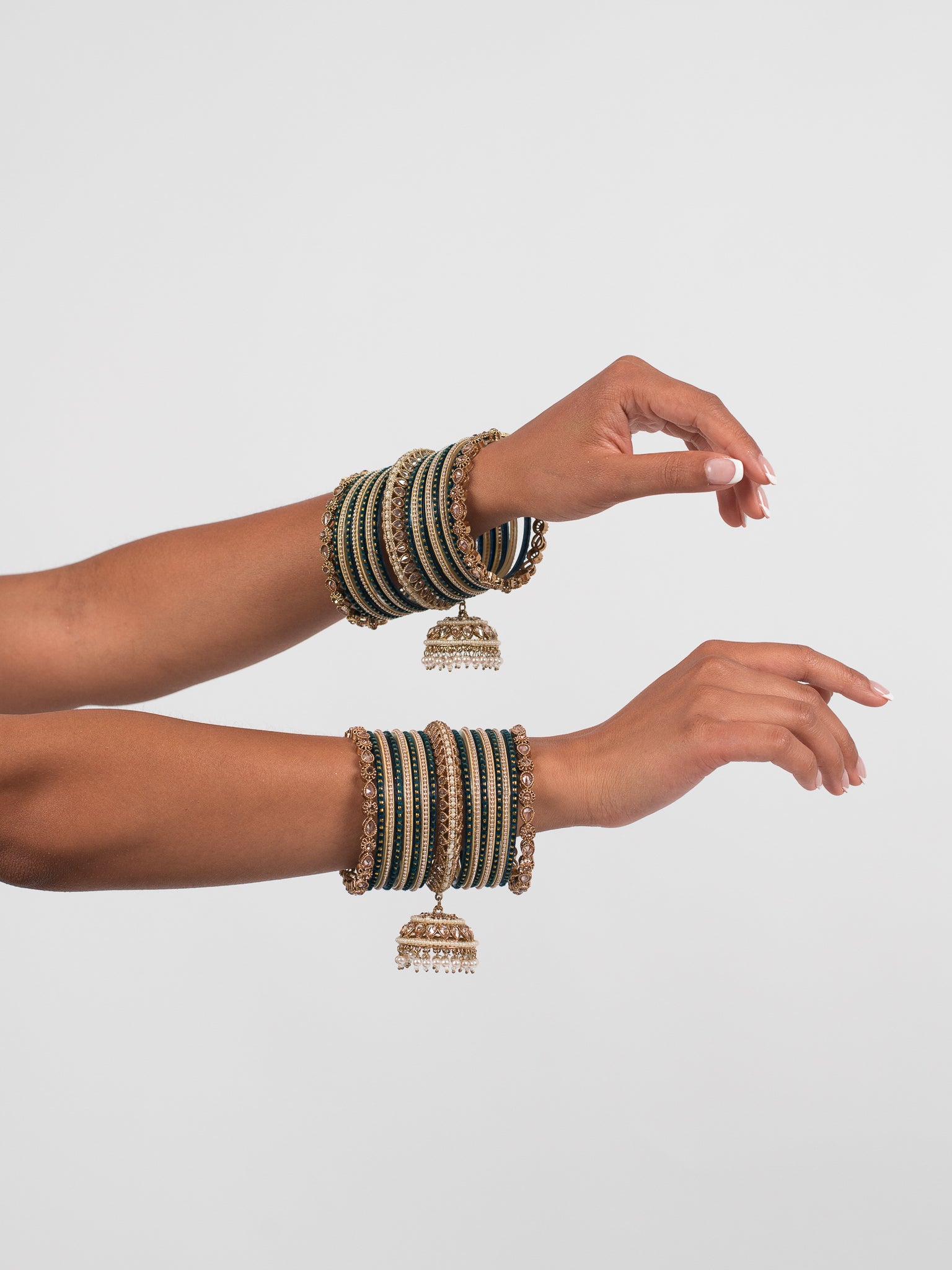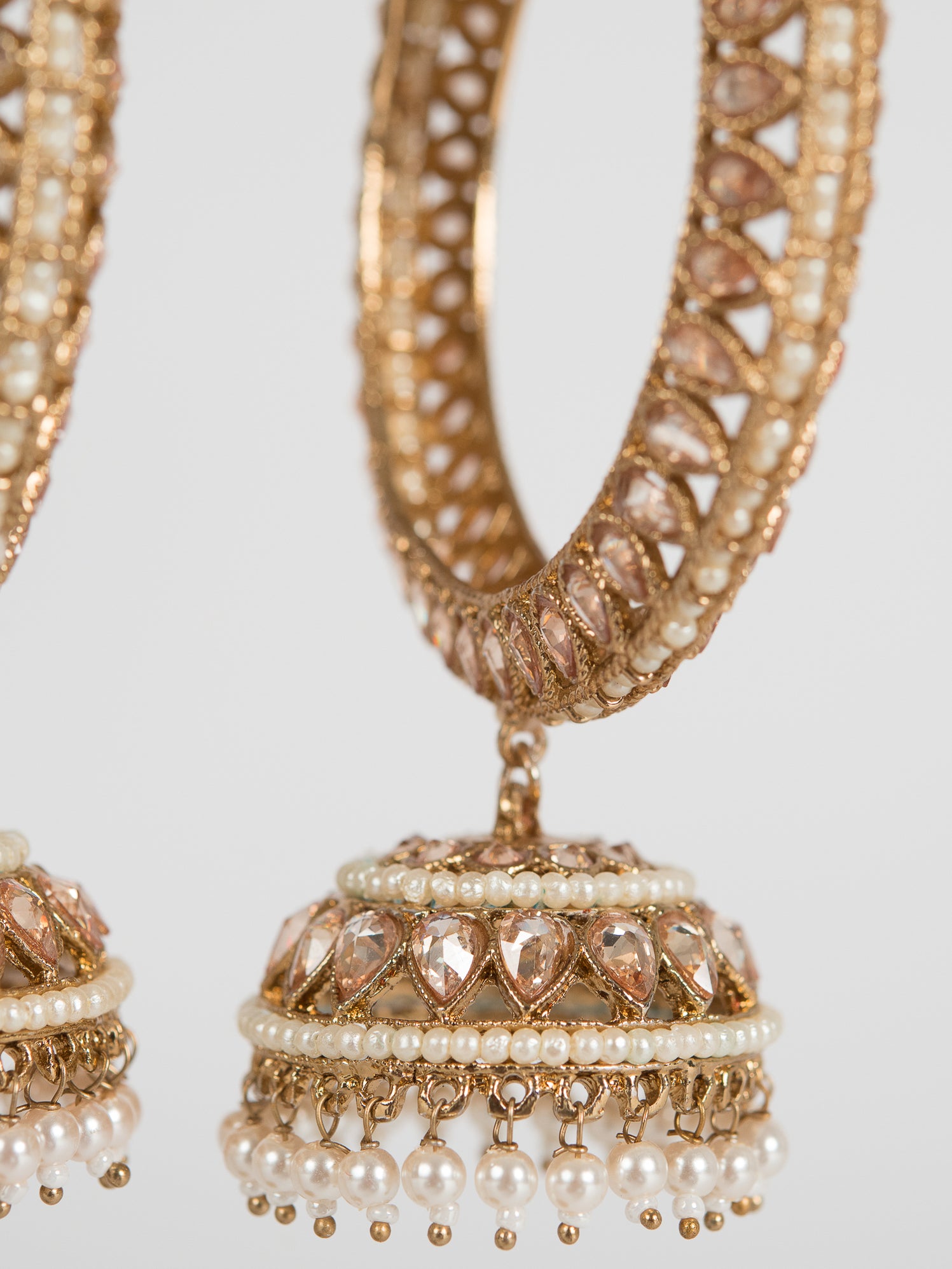Adorn your arms with our Champagne Soleil Kangans. These kangans have champagne almond shaped gems on either side, with cream stones dividing both sides in the centre. The hanging champagne jhumki adds the drama for you to wear as is or in a curated bangle set.