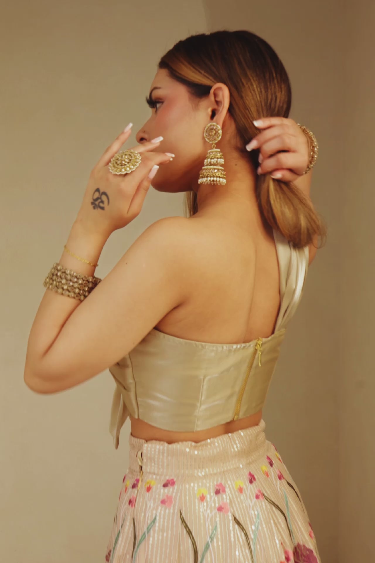 The Champagne Stacked Jhumkis are statement earrings. These earrings have a circle base with 2 chandelier tiers. We love the pearl and champagne gem tones paired together. The length of the earrings are about 3.5". These earrings are meant for pierced ears.