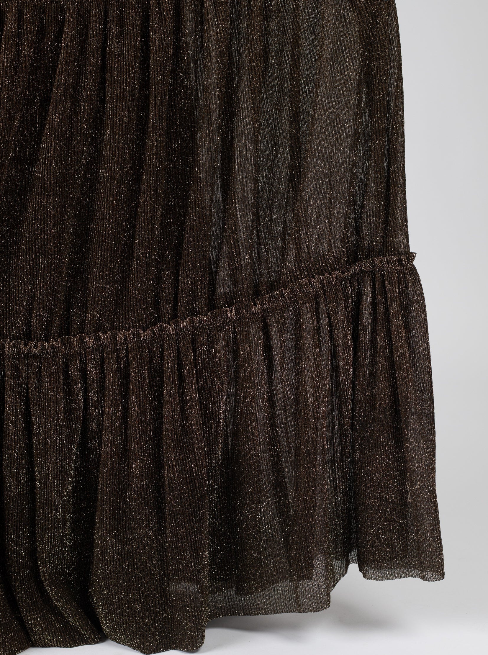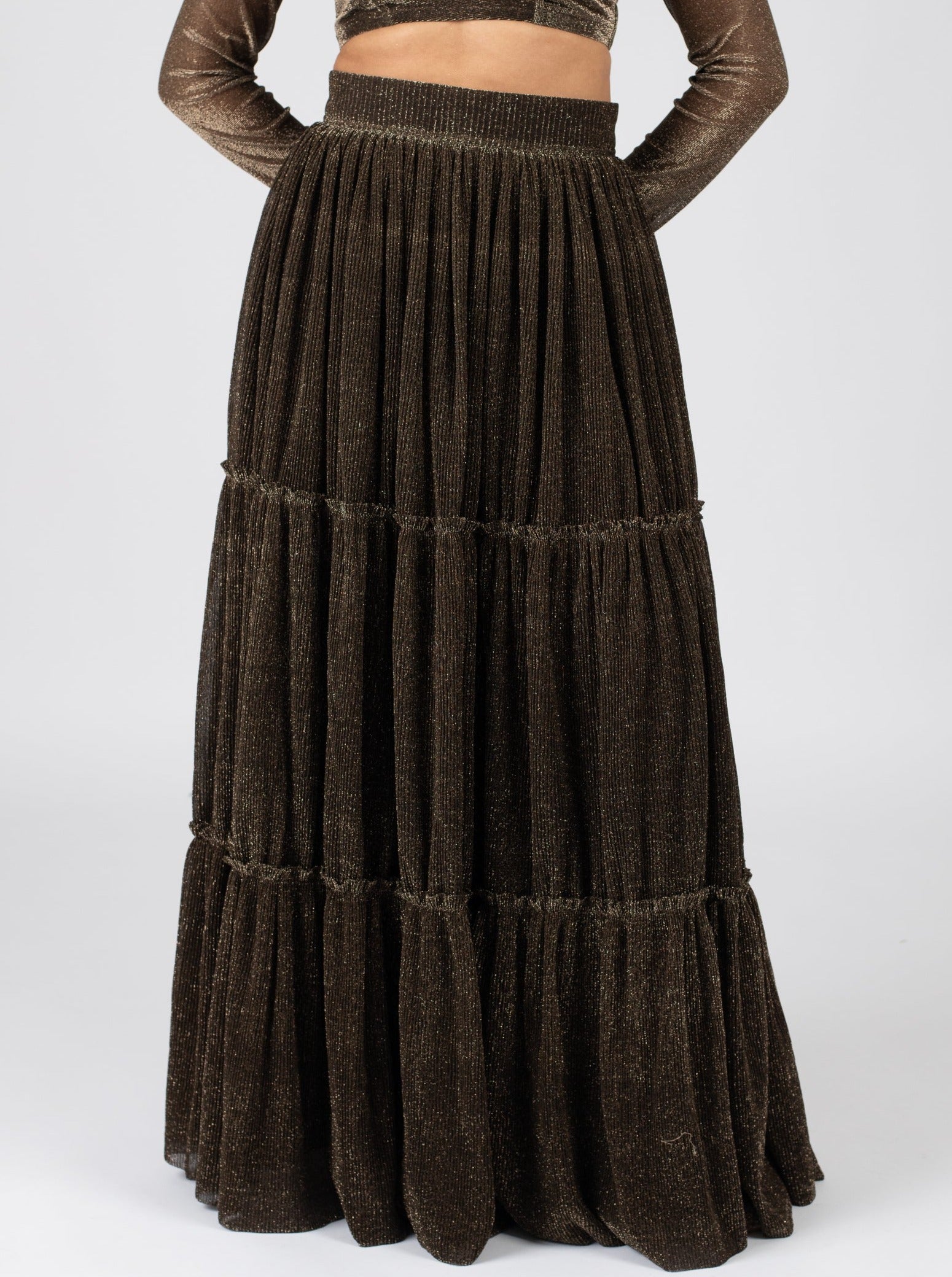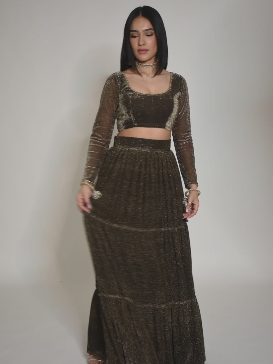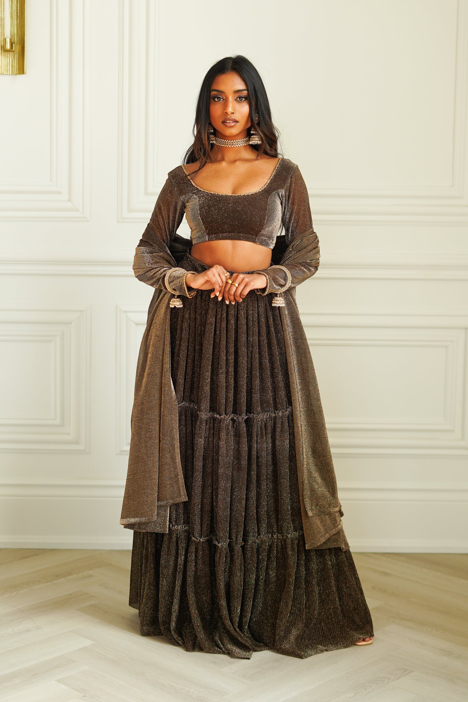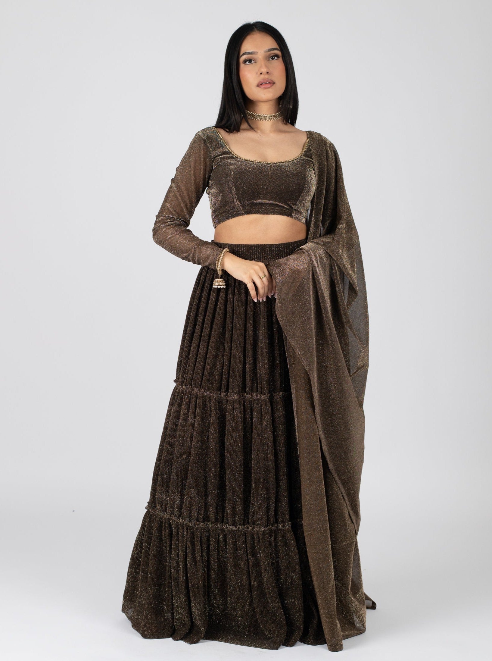 Experience the glamour of old Bollywood with our Cocoa Crush Skirt. Crafted from a stretchy and crushed fabric, this tiered skirt is playful. Styled with a matching dupatta and blouse, it's perfect for any occasion. Embrace the classic beauty of Desi fashion with this stunning piece.