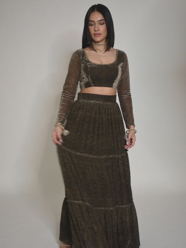 Experience the glamour of old Bollywood with our Cocoa Crush Skirt. Crafted from a stretchy and crushed fabric, this tiered skirt is playful. Styled with a matching dupatta and blouse, it's perfect for any occasion. Embrace the classic beauty of Desi fashion with this stunning piece.