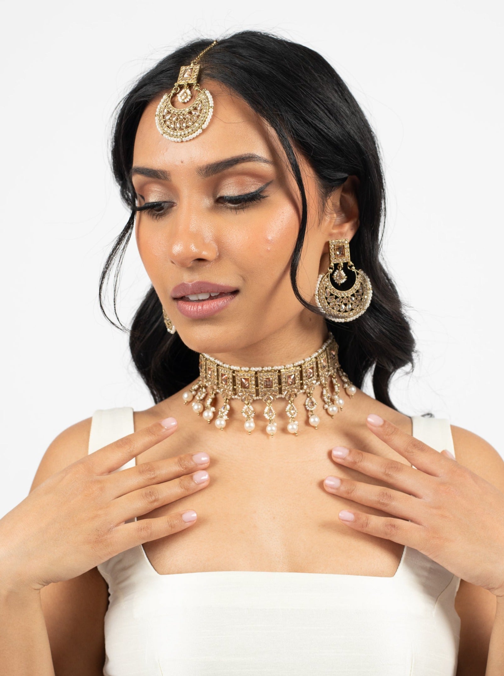 This choker is sold separately from the matching earrings and tikka set. This choker can be worn on the higher or lower part of your neck–with the included adjustable neck tie.