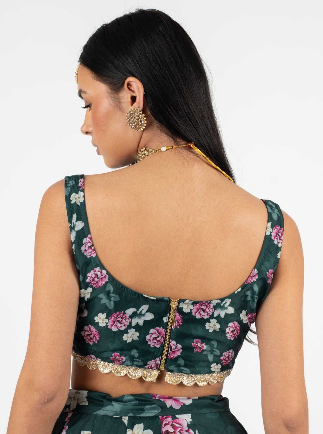 Introducing The Melrose Blouse: a new blouse cut in an emerald green organza fabric with white and pink floral motifs. This blouse features a chic scalloped border at the bottom, adding a touch of elegance to its vintage cut. Perfect for pairing with sarees or skirts, The Melrose Blouse effortlessly embodies grace and versatility for any occasion.
