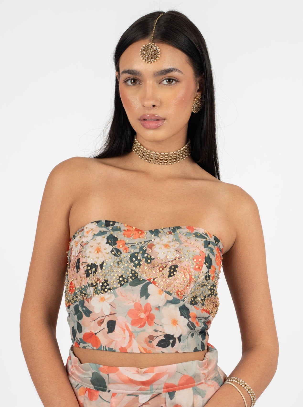 Introducing The Floral Garden Blouse, our latest design featuring a tube top cut with a stylish tie closure down the back, allowing you to adjust it for your perfect fit and comfort. Adorned with shimmering gold sequins embellishing the chest area, this blouse showcases a beautiful and vibrant floral print on a soft organza fabric. Notably longer than our standard blouses, it offers a unique silhouette that radiates style. Perfect for pairing with skirts or sarees, The Floral Garden Blouse combines modern flair with timeless beauty for any occasion.