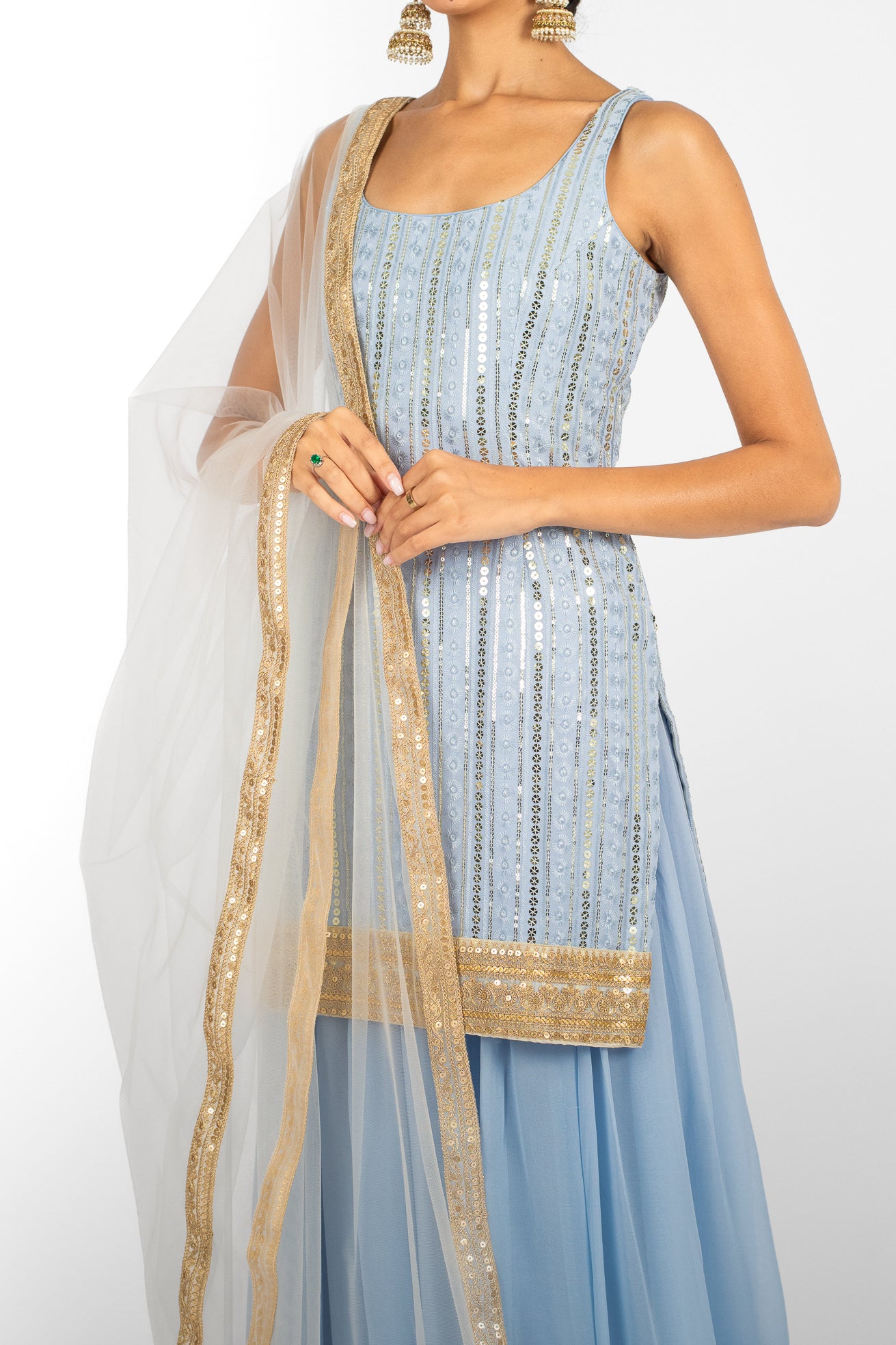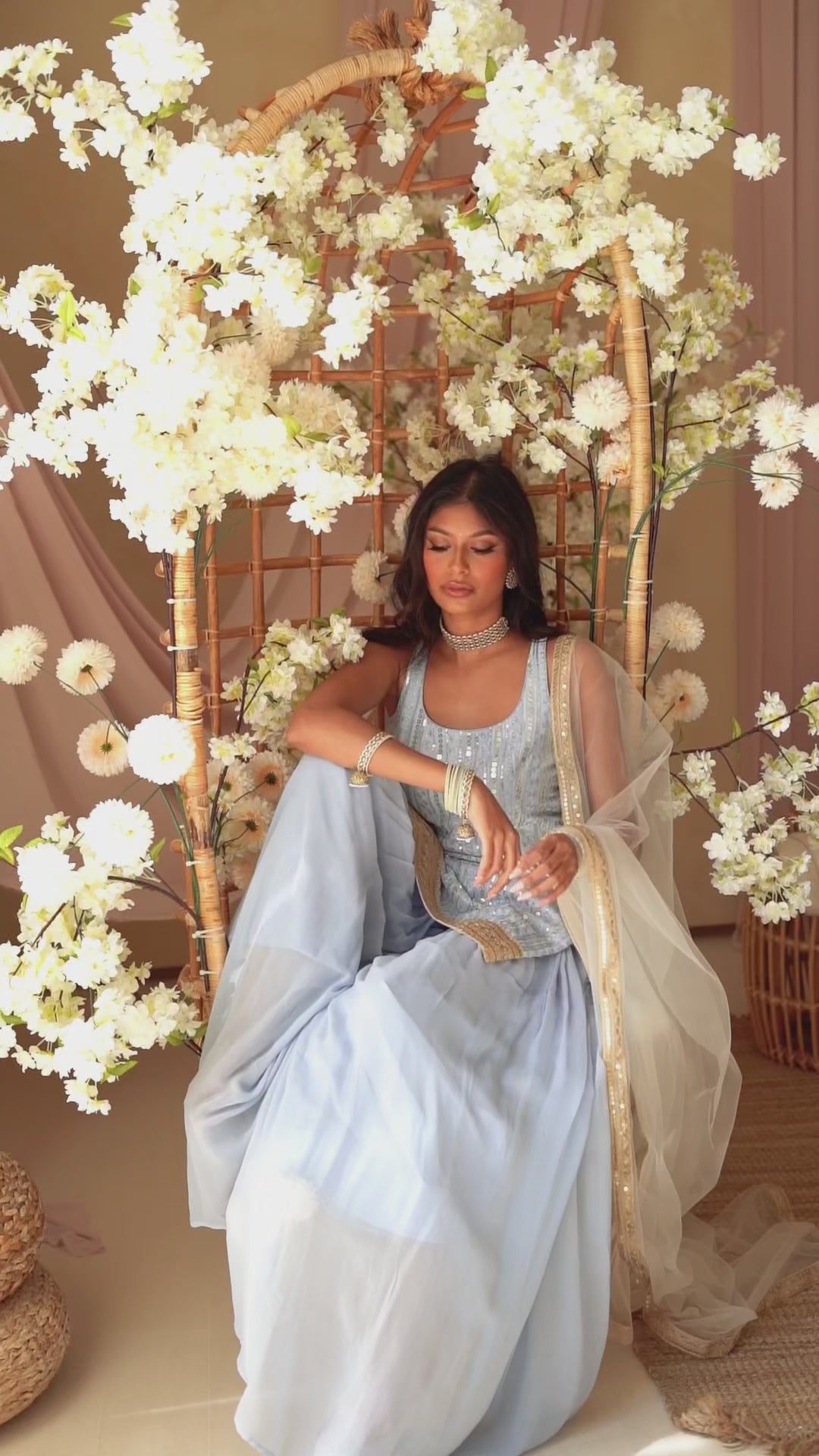 Discover timeless elegance with the Ice Blue Amethyst Suit, a beautiful fusion of classic style and modern comfort. Made from soft georgette fabric, this suit is as comfortable as it is luxurious, making it perfect for long ceremonies or events.