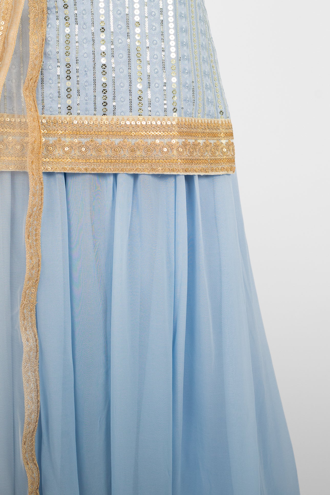 Sharara. Georgette Composition. Threadwork Embroidery. Gold Border Detailing. Dupatta Included.