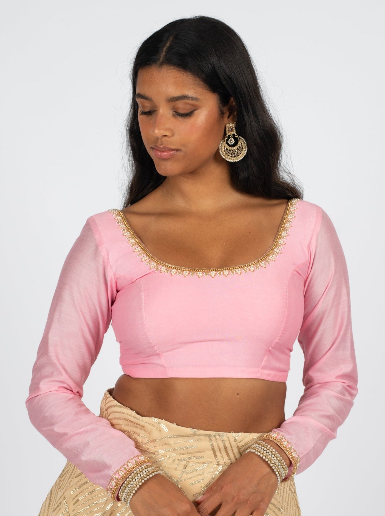 Our Light Pink Leyla Blouse captures sophistication and elegance with its exquisite handwork detailing the neckline and bottom of the sleeve. Crafted from silk, this blouse radiates class to complete the perfect outfit.