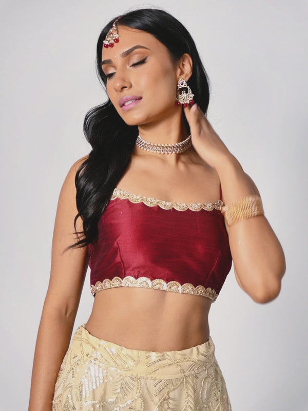 The Maroon Khloe Blouse is a chic and trendy top designed to offer endless pairing opportunities. It effortlessly blends traditional elegance with a touch of modern flair. Crafted from luxurious silk fabric, the standout feature of the blouse is its stunning gold scalloped border, adding just the right amount of detailing to elevate your look. Whether paired with a skirt or a saree this versatile blouse is sure to make a statement wherever you go.