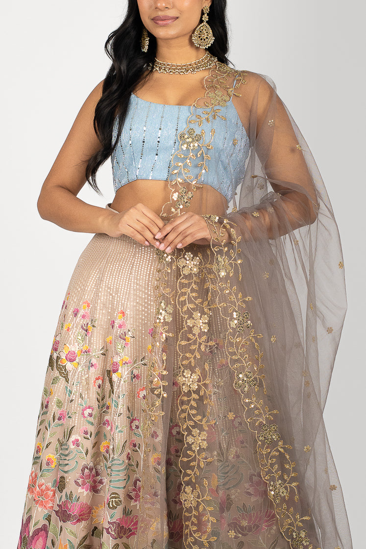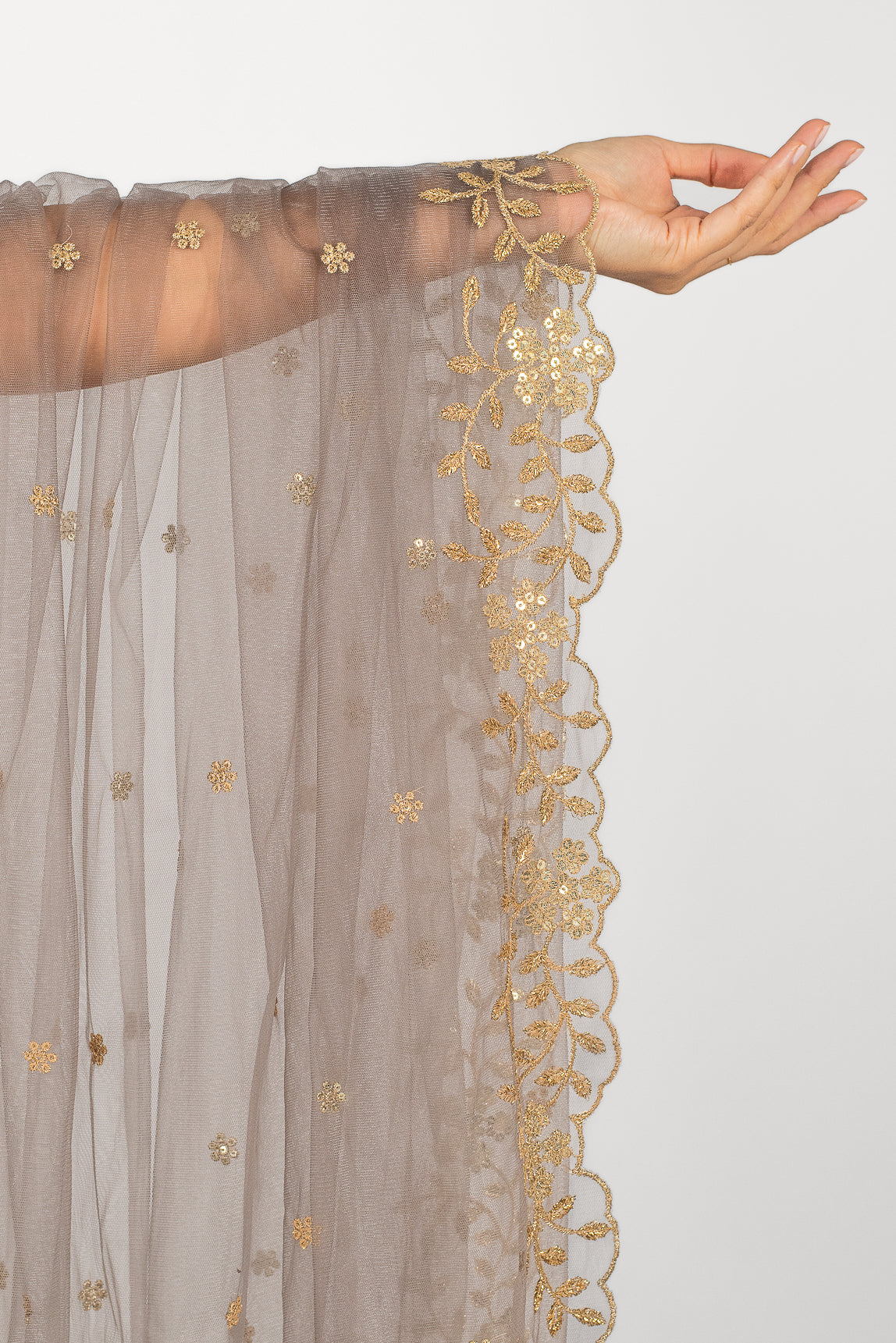 “The Moonlit Grey tone is so unique and the floral gold border completes this dupatta.” - Sofi Kassam, Co-Founder & Designer
