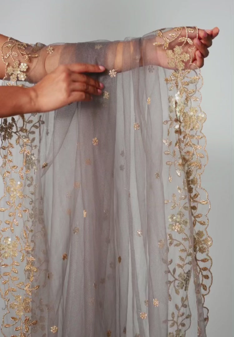 The Moonlit Mist Dupatta features a soft net fabric in a serene Moonlit Grey, elegantly adorned with an intricate gold floral border and mini florals throughout. This dupatta radiates grace and fashion, making it the perfect accessory to elevate any traditional outfit.