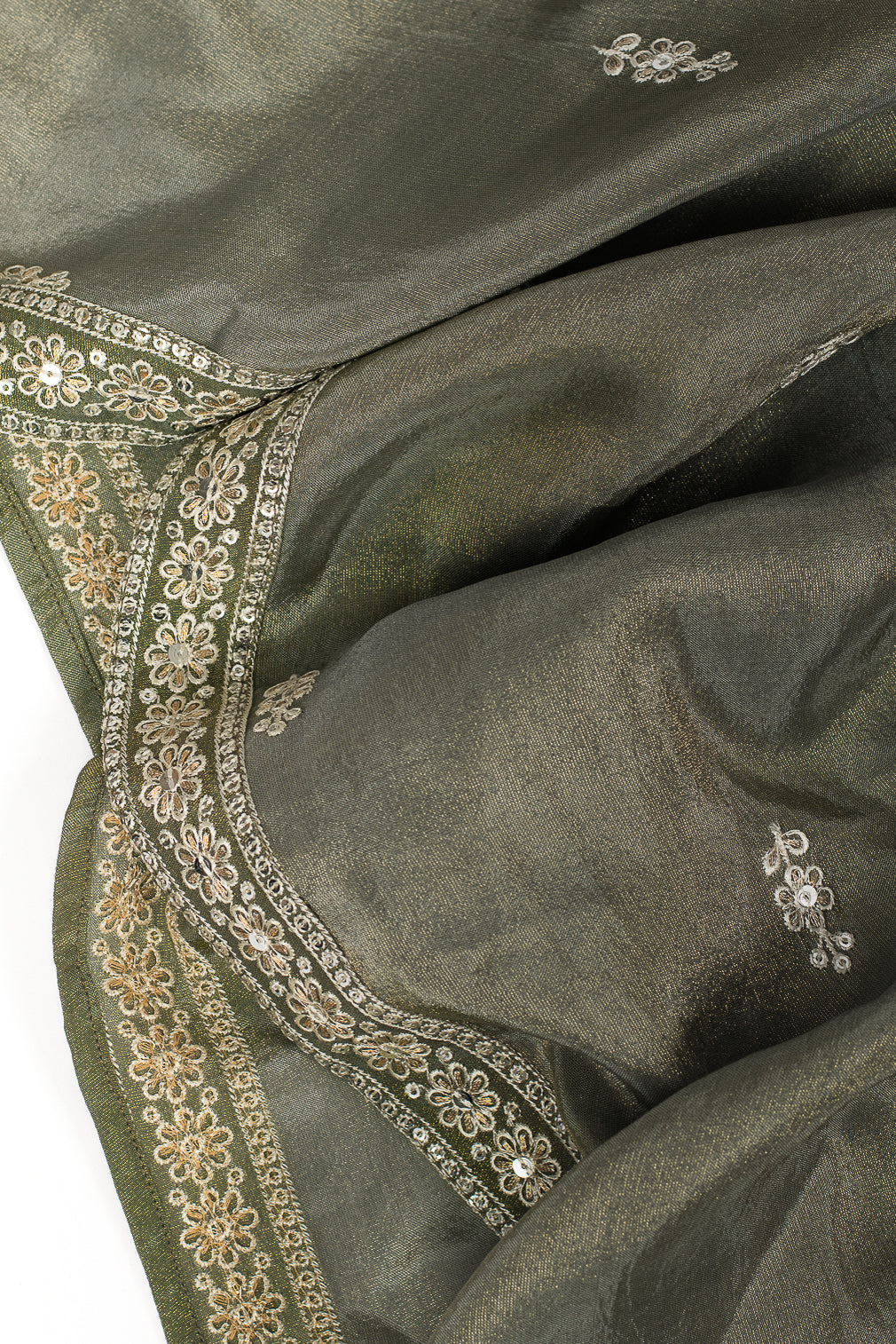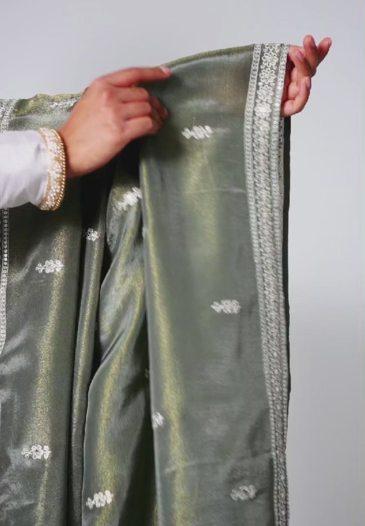 The Moss Sheen Dupatta in a lustrous dupion silk showcases delicate threadwork and an elegant drape, offering a refined touch of tradition to your look. The rich moss green shade brings a touch of earthy elegance, blending traditional charm with a modern, refreshing hue.