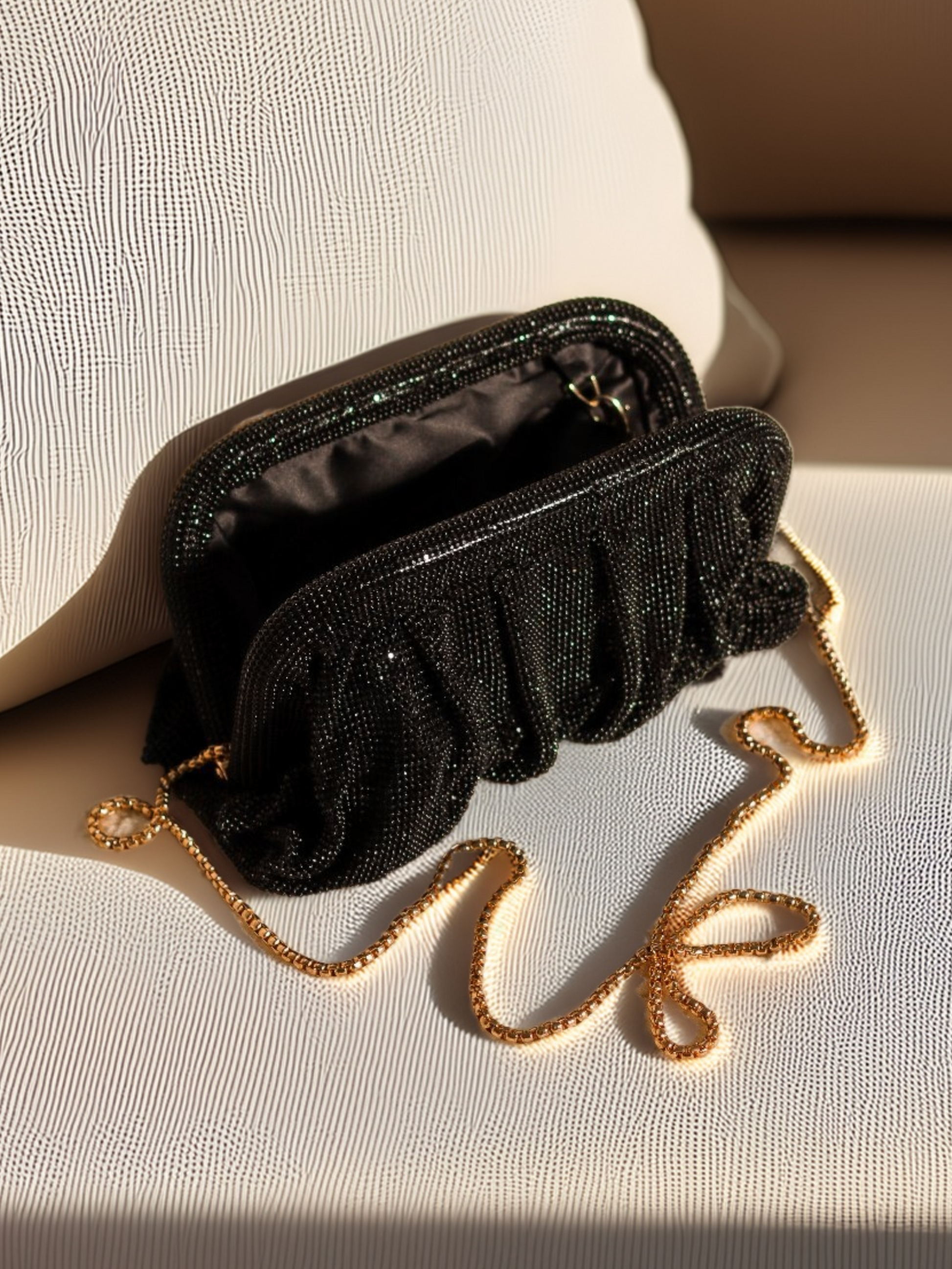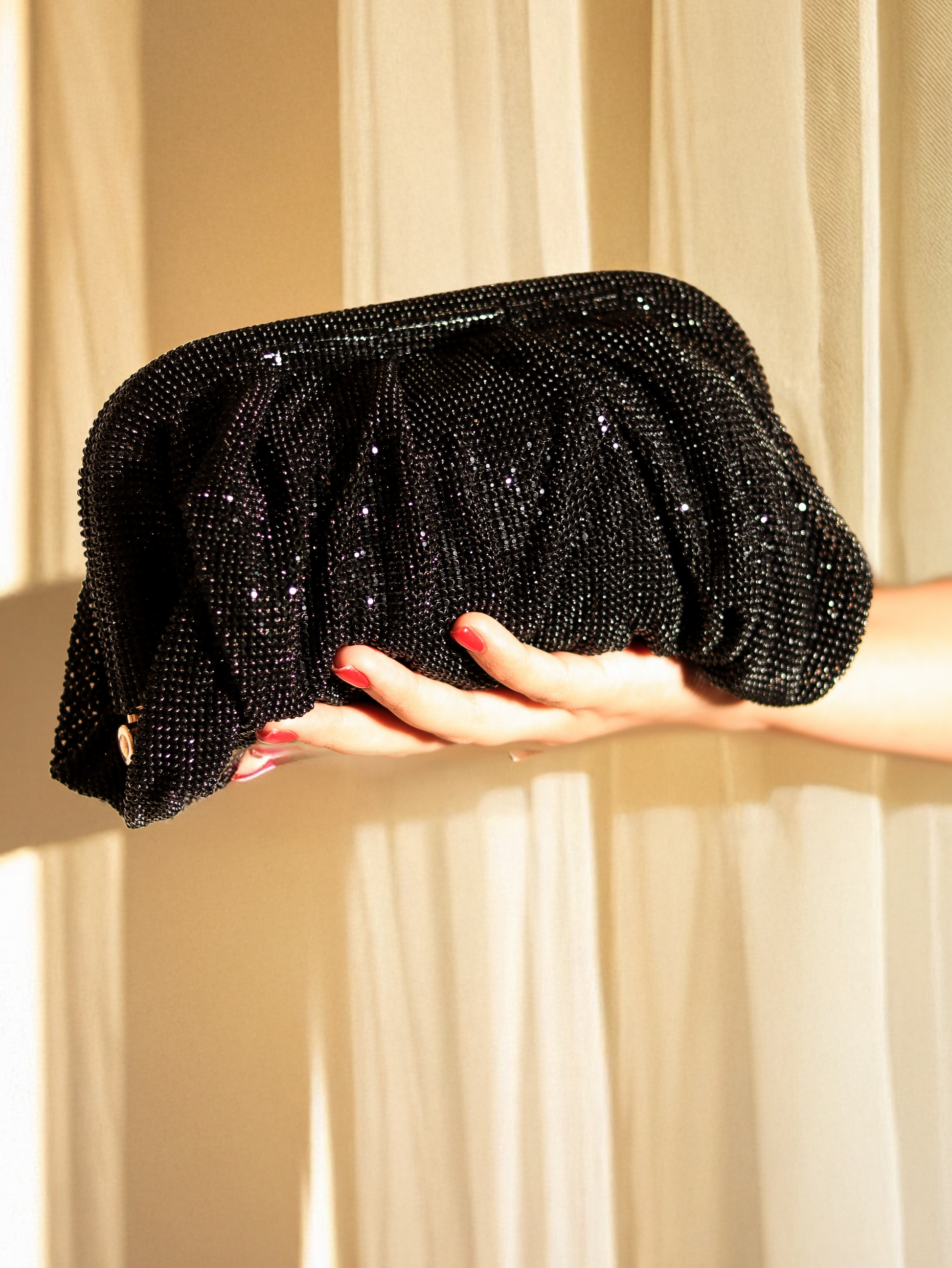 The Noir Starlight Clutch is a radiant blend of elegance and modern edge. Crafted from soft crystal fabric in a deep black hue, its subtle sheen captures the light with every movement. The gathered silhouette adds texture and charm, making it the perfect accent for evening wear. Lightweight and luminous, it’s your go-to for effortlessly polished nights out.