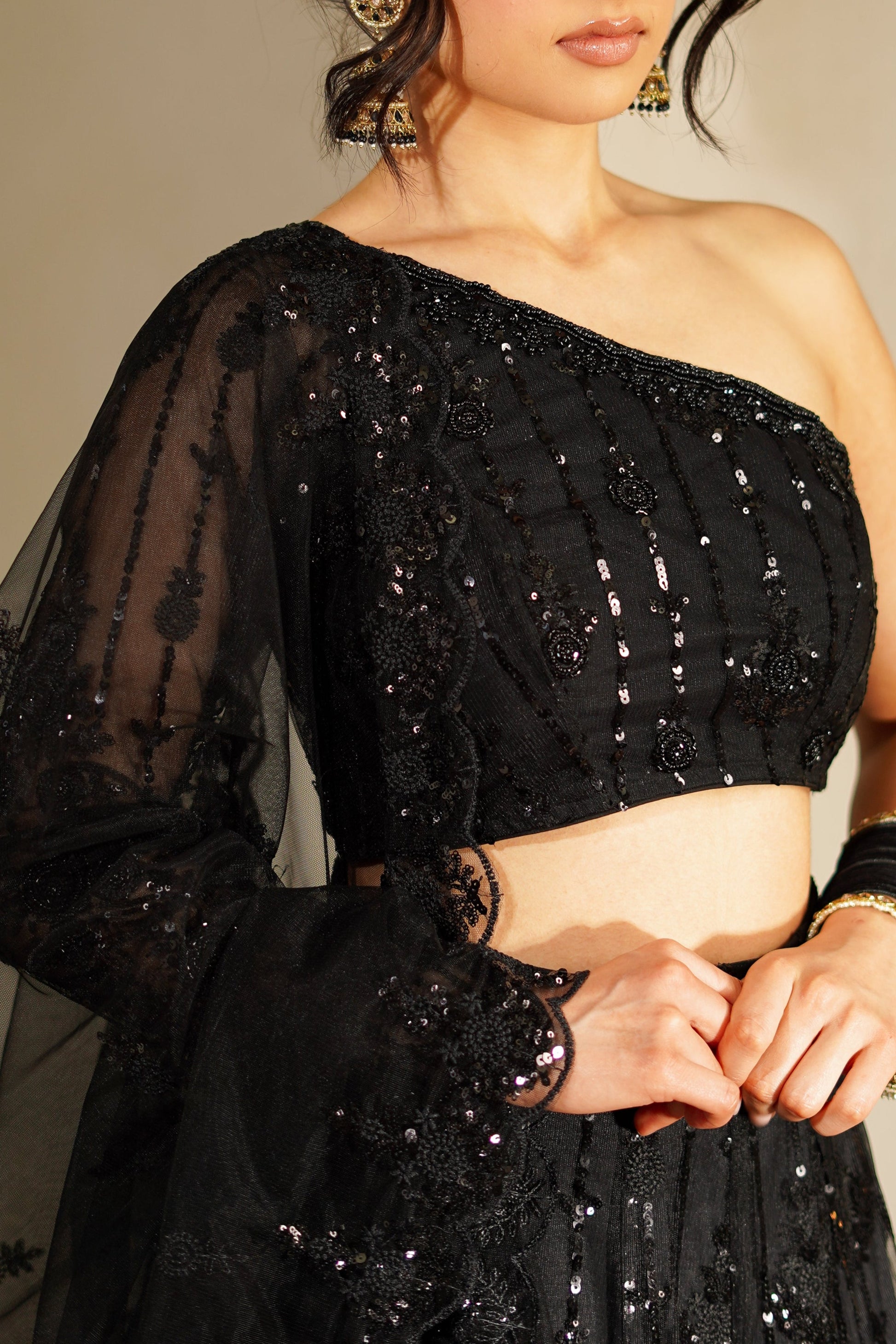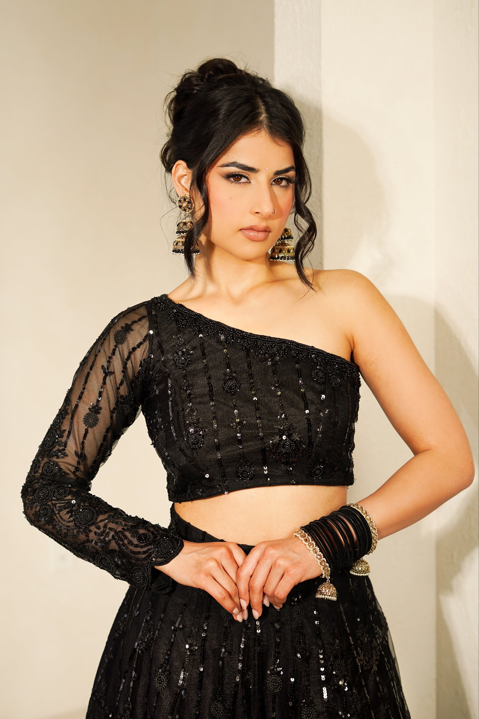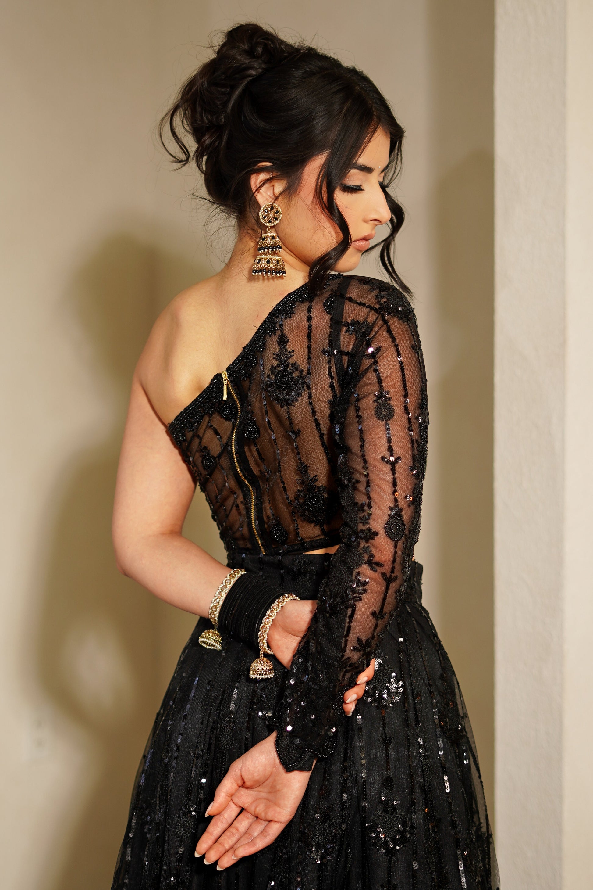 Dramatic. Sophisticated. Spellbinding. The Obsidian Dusk Blouse is a statement in midnight elegance, crafted for the modern muse who isn’t afraid to turn heads. Made from intricately embroidered net fabric, this one-shoulder blouse features a sheer full sleeve and back that reveal delicate threadwork and sequin detailing against the skin.
