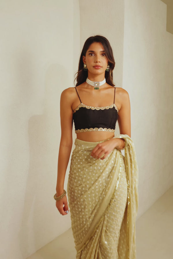 The Onyx Khloe Blouse is a chic and trendy top designed to offer endless pairing opportunities. It effortlessly blends traditional elegance with a touch of modern flair. Crafted from luxurious silk fabric, the standout feature of the blouse is its stunning gold scalloped border, adding just the right amount of detailing to elevate your look. Whether paired with a skirt or a saree this versatile blouse is sure to make a statement wherever you go.