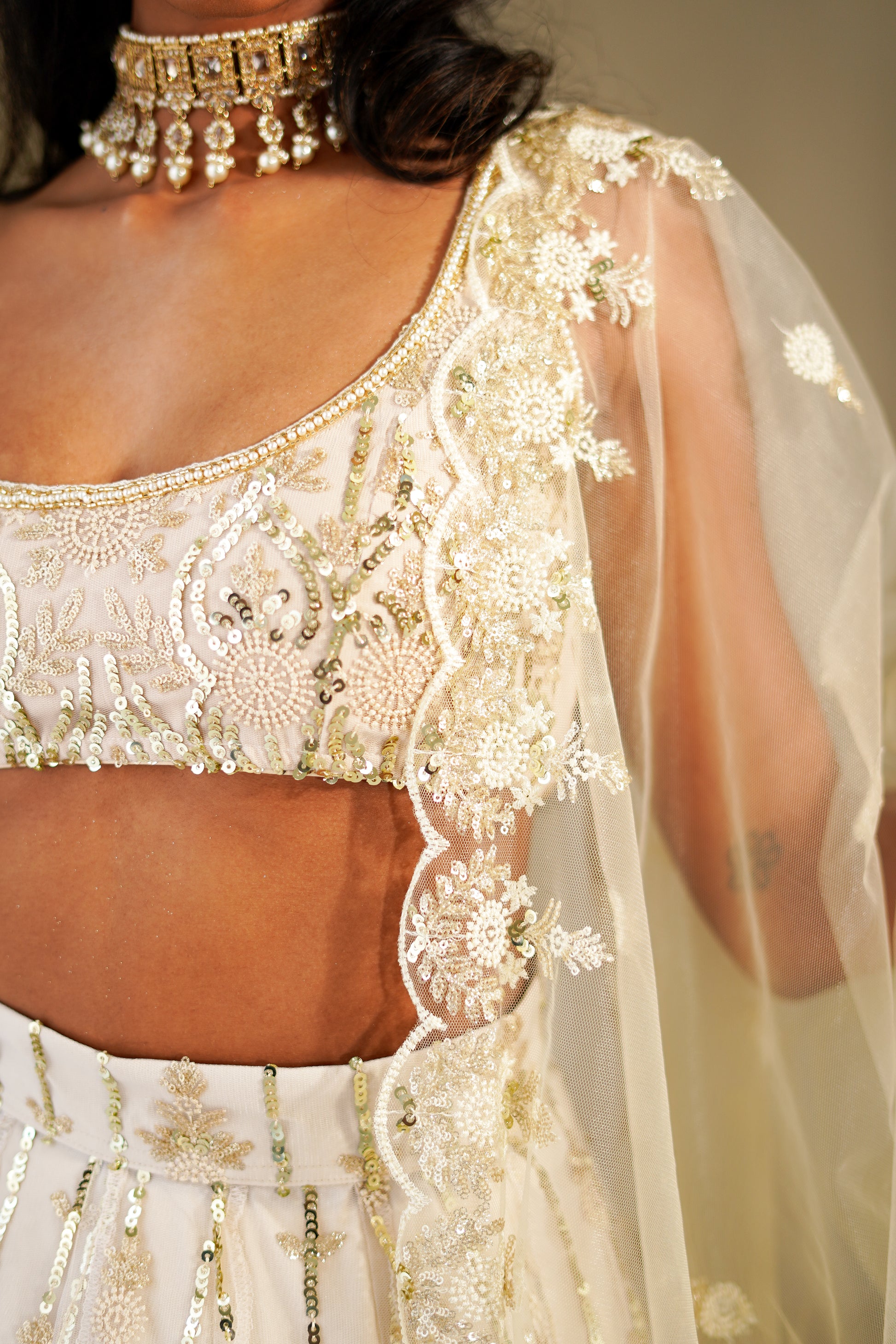 Net Fabric Composition. Sequin and Threadwork Embroidery. Scalloped Border.