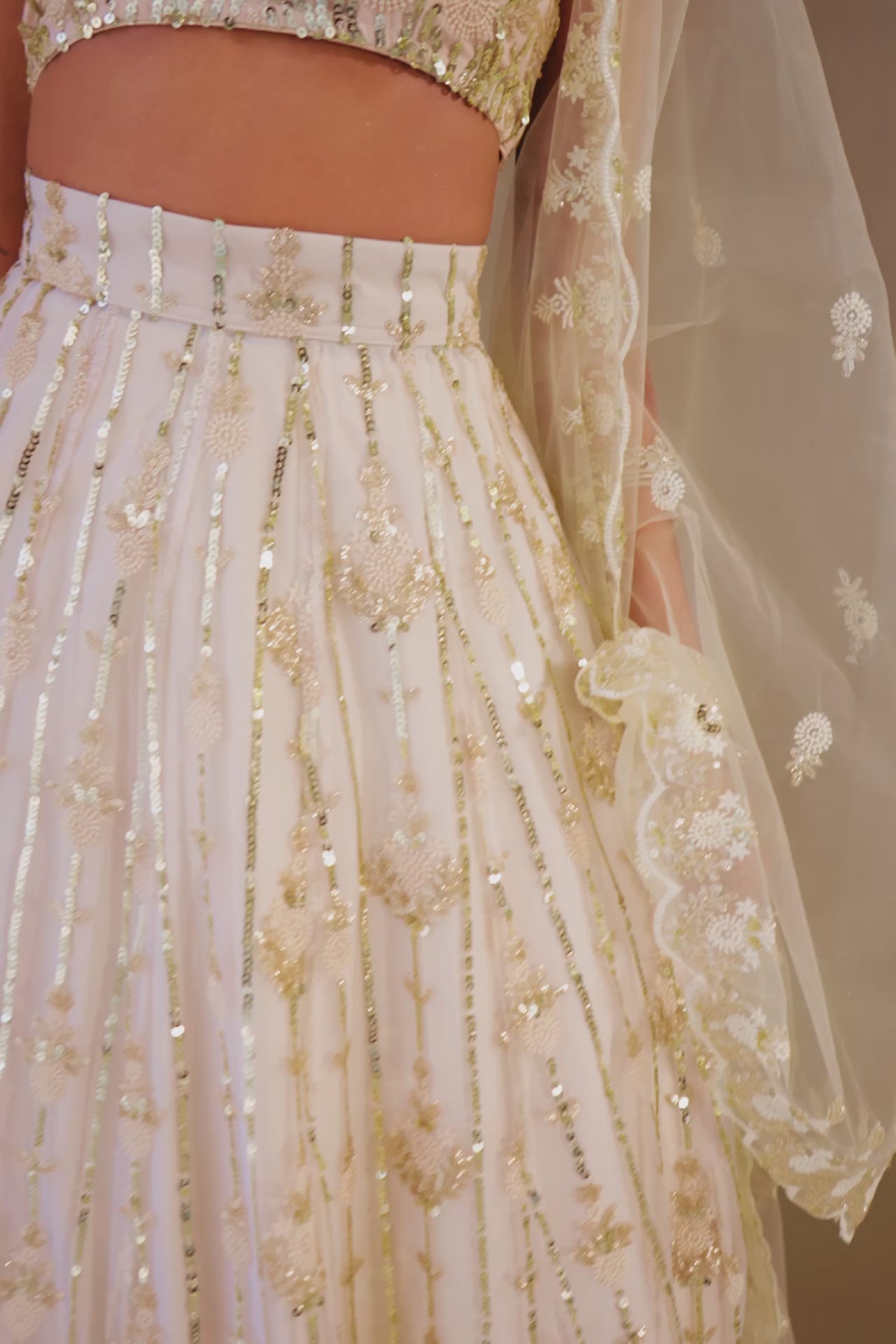 Light as air and delicately luminous, the Opaline Dusk Dupatta is a romantic layer of embroidered net. The border is adorned with tonal threadwork embroidery and motifs, finished with gentle scalloped edges, adding an ethereal softness to any ensemble.