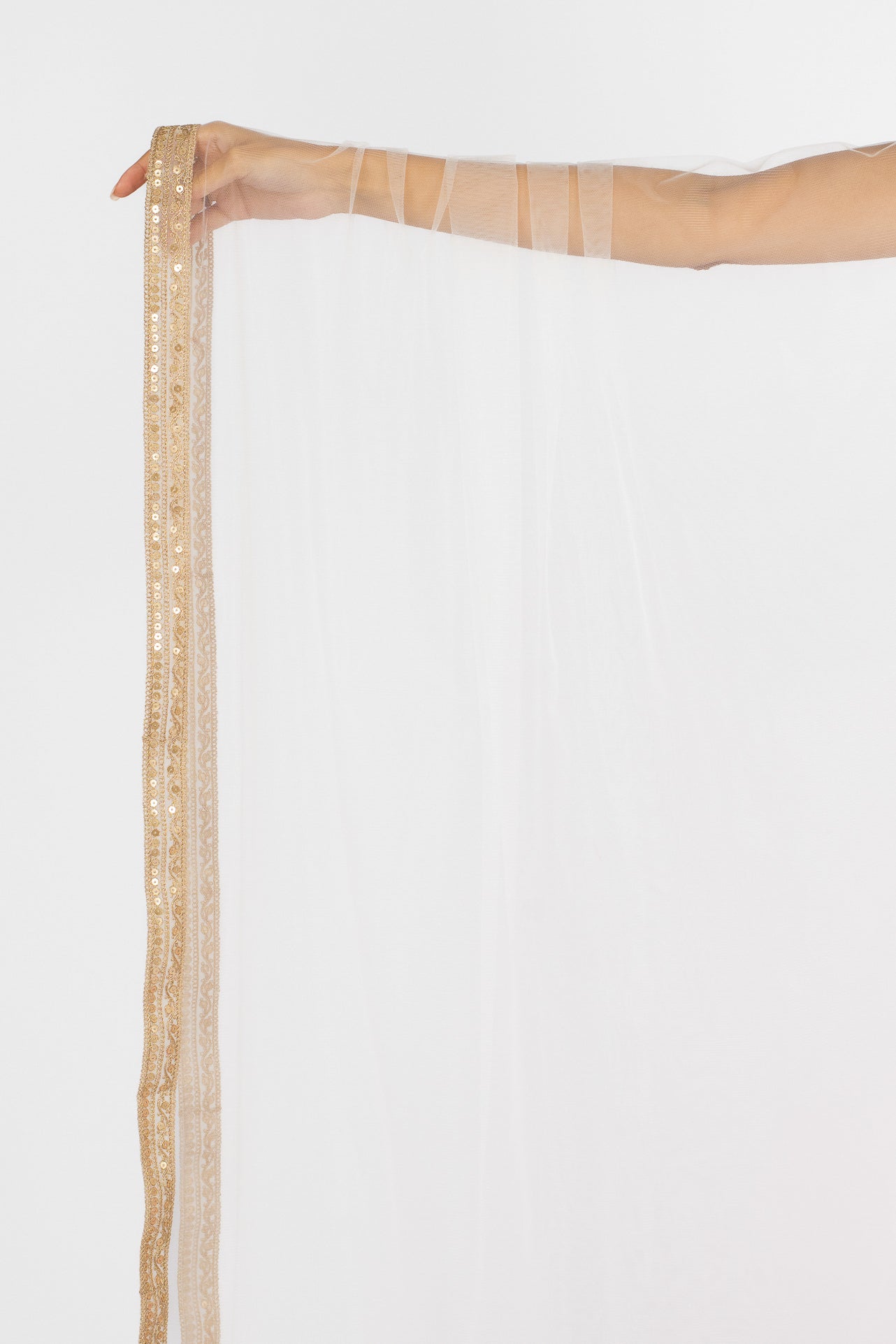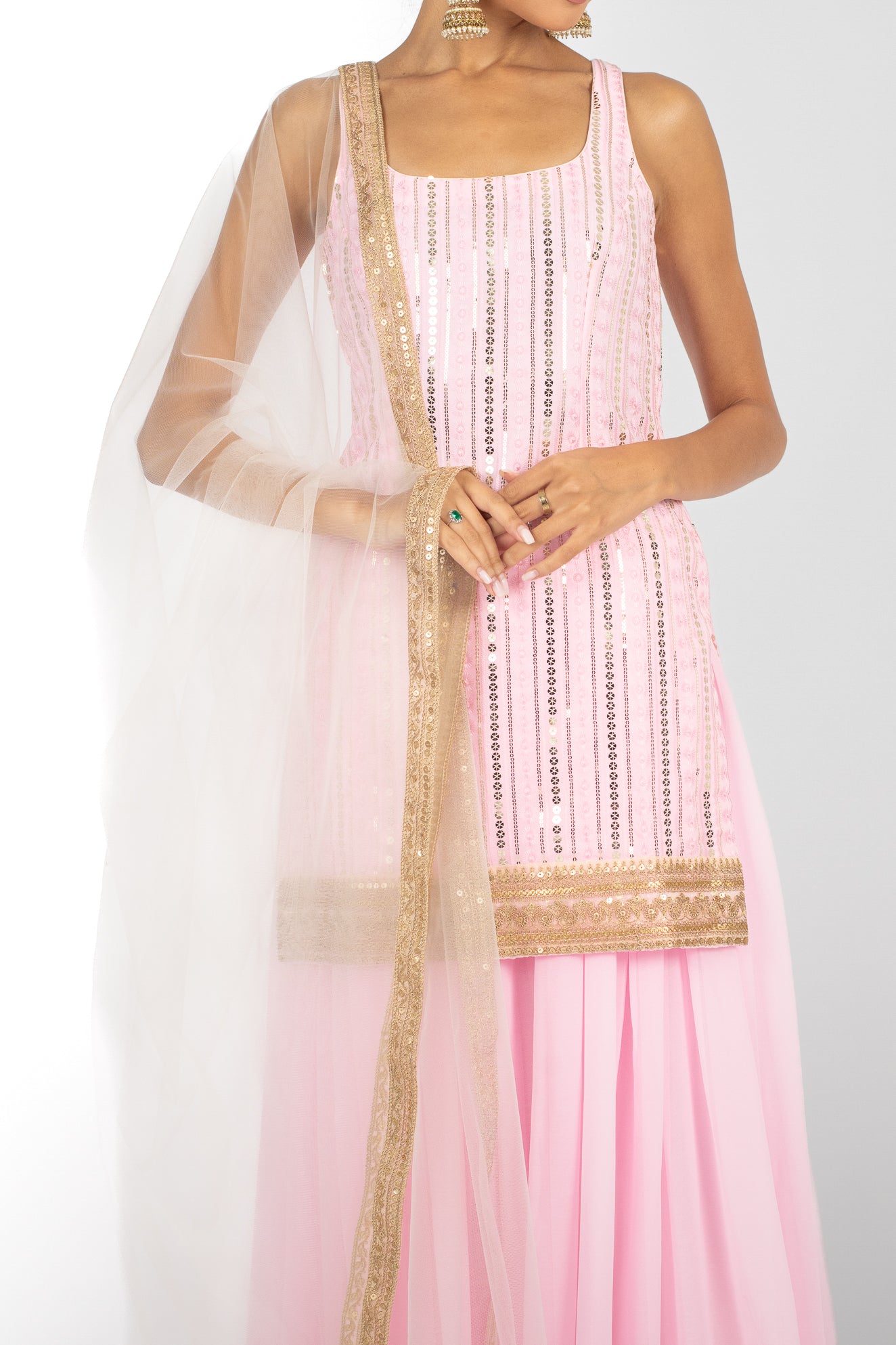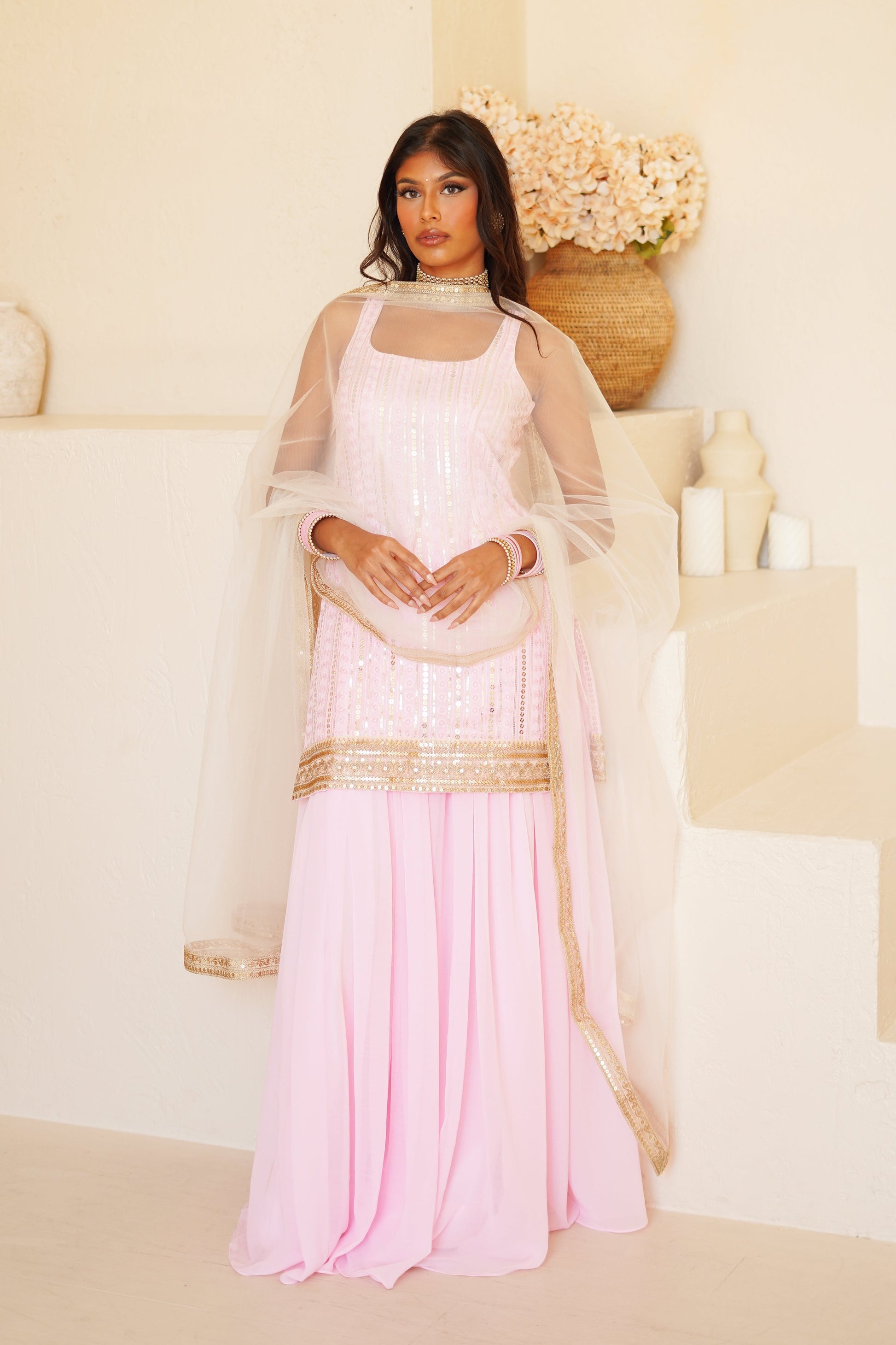 Sharara. Georgette Composition. Threadwork Embroidery. Gold Border Detailing. Dupatta Included.