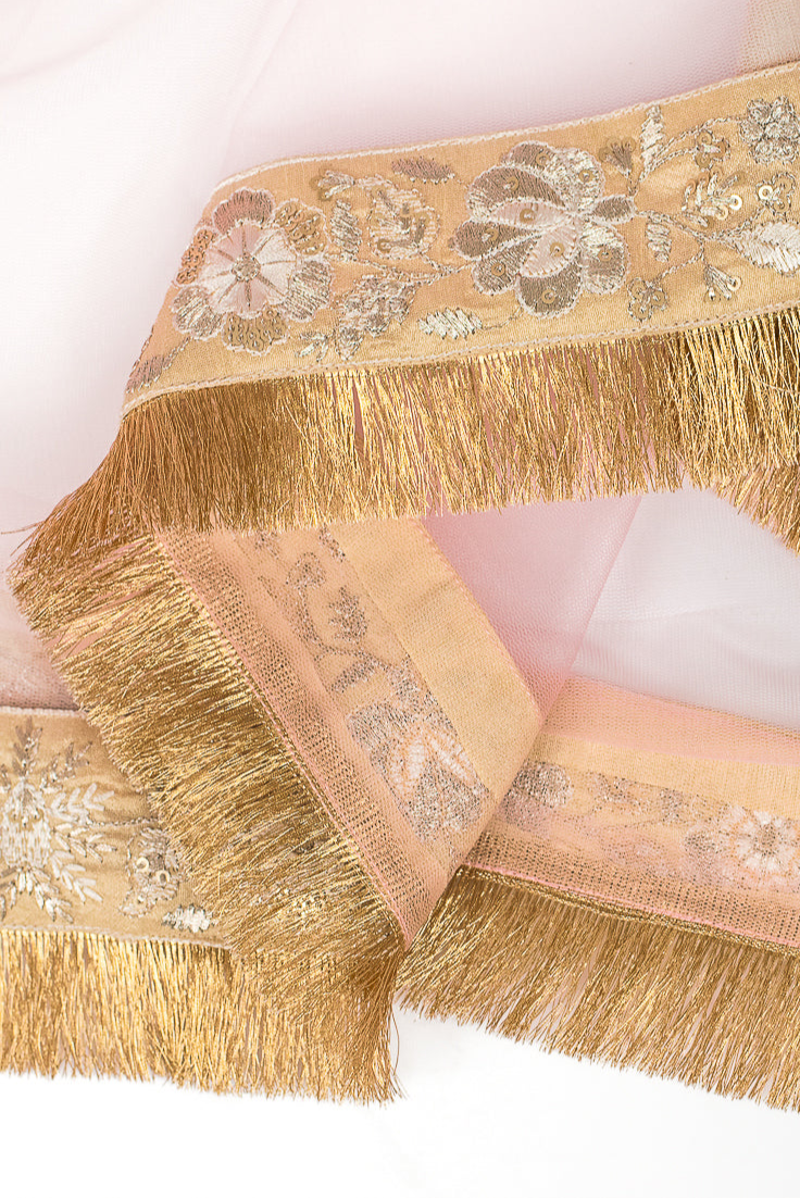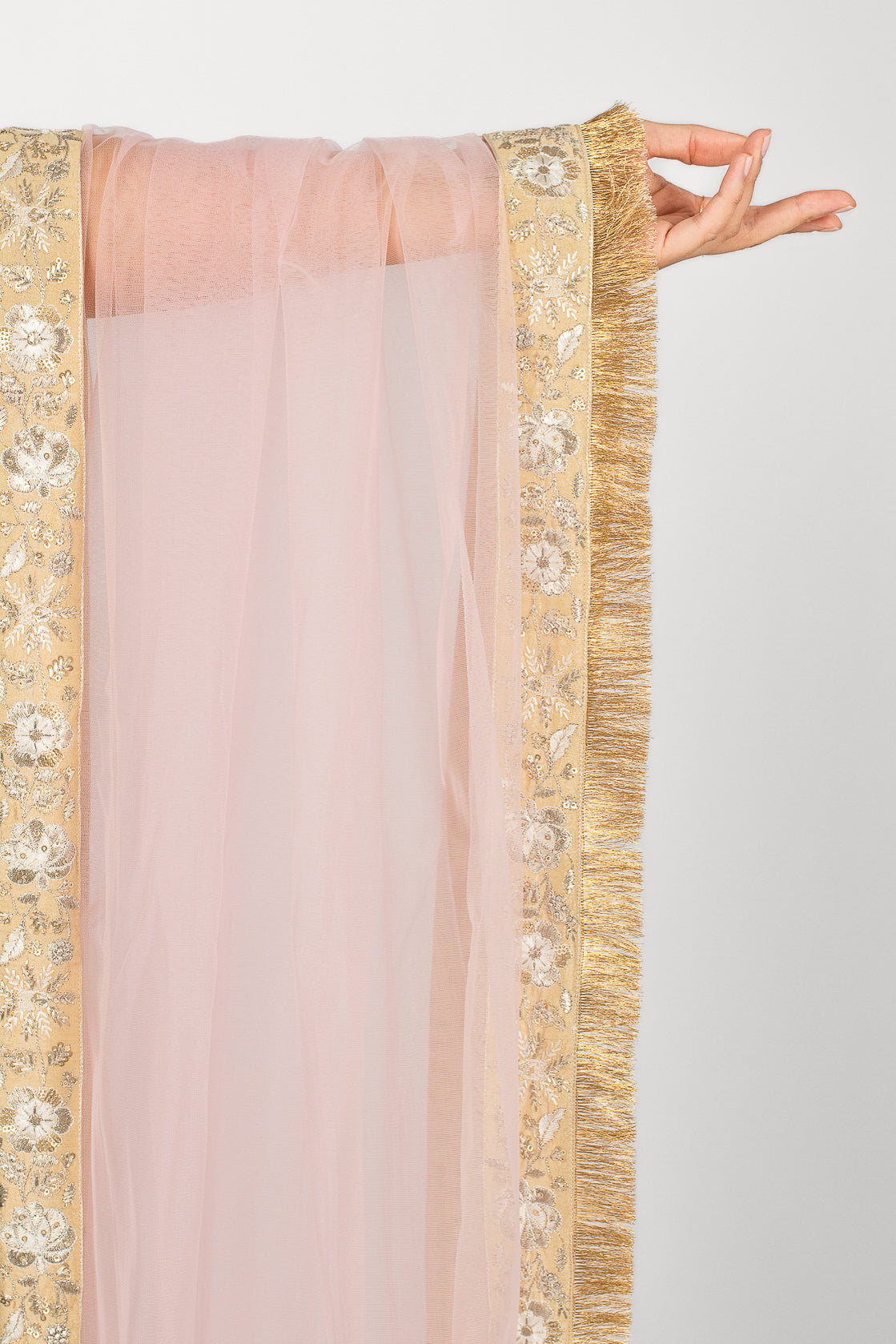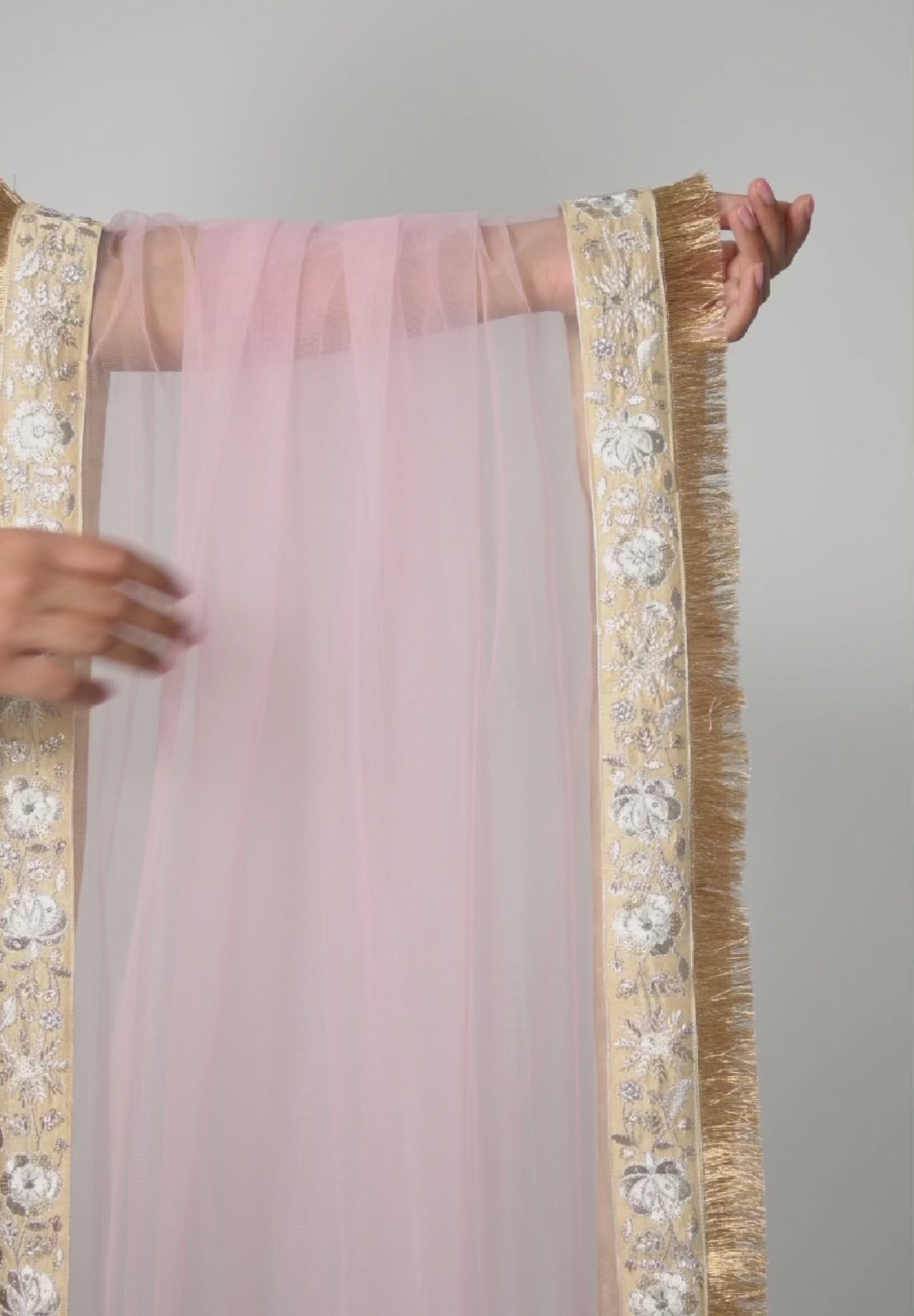 The Pink Fringe Dupatta is a timeless piece that adds an elegant touch to any outfit. Crafted with a soft pink hue, this dupatta features a luxurious gold floral border and a classic fringe finish, lending a delicate yet striking accent to your ensemble. Perfect for elevating both modern and traditional looks with a single drape.