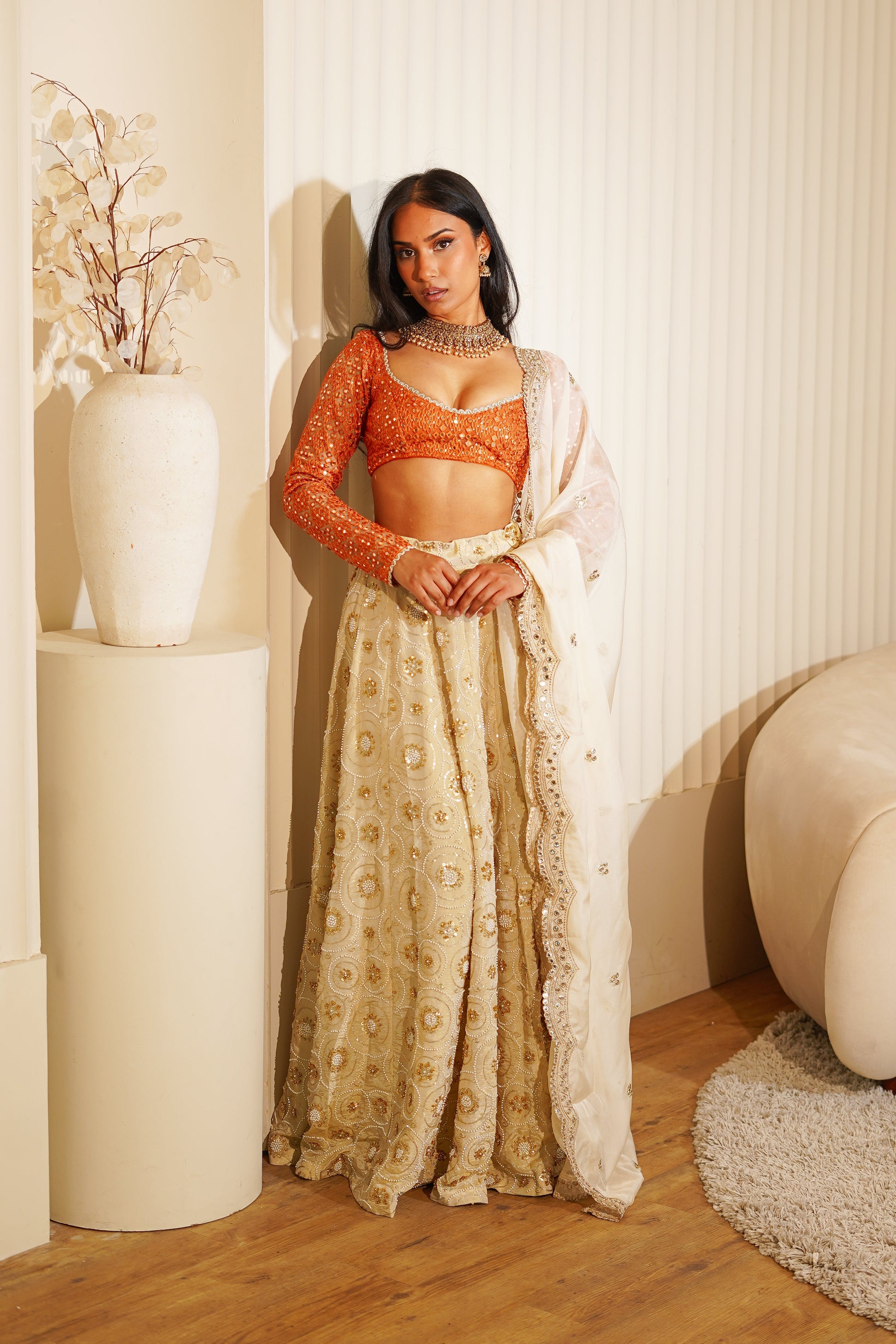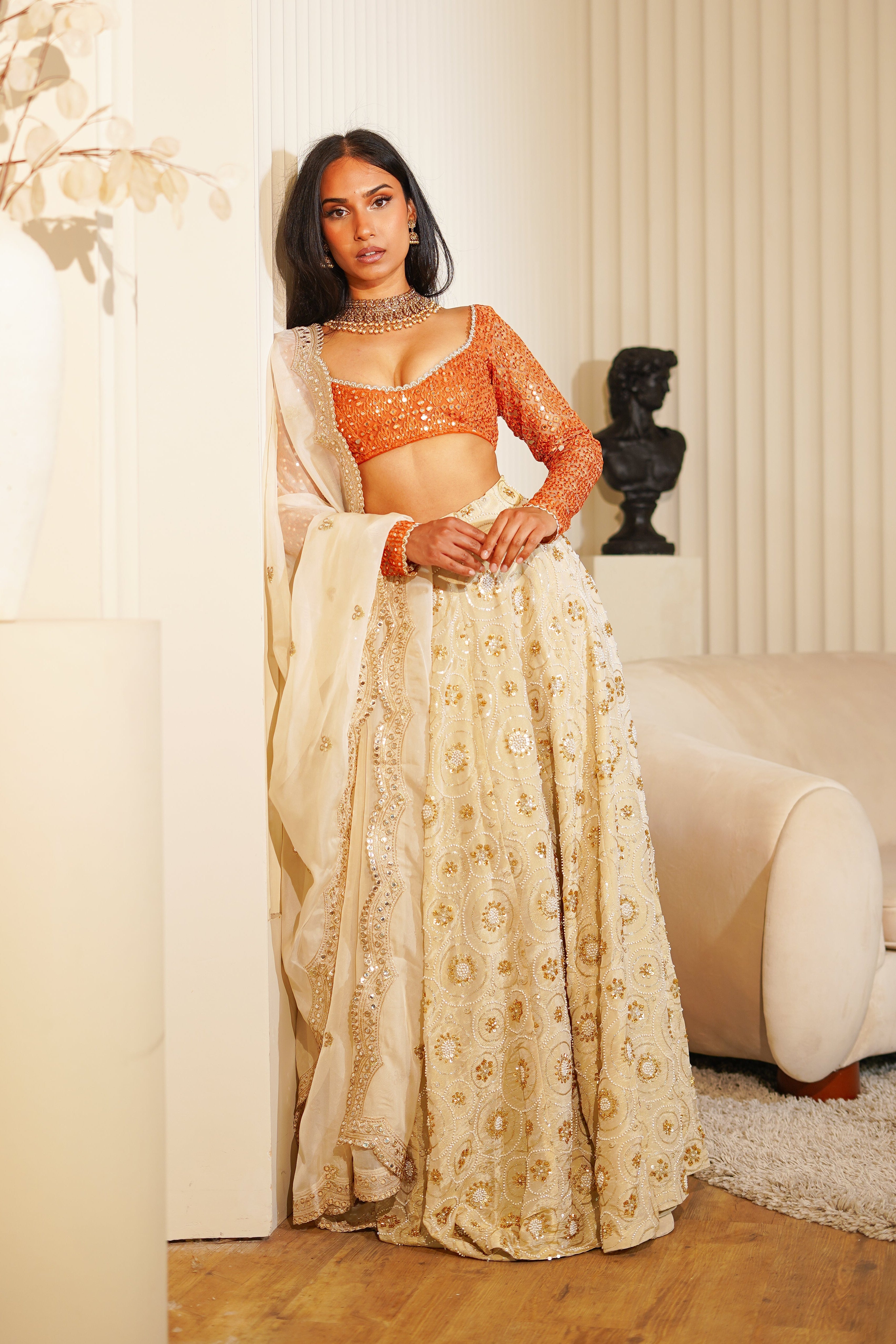 The Rust Mirabel Blouse is a full-sleeved micro blouse with a sweetheart neckline and U-back with tie, rendered in soft net fabric. Its intricate mirrorwork embroidery radiates opulence, offering a luxe, traditional feel that is both striking and timeless. A piece designed to be treasured and passed down.