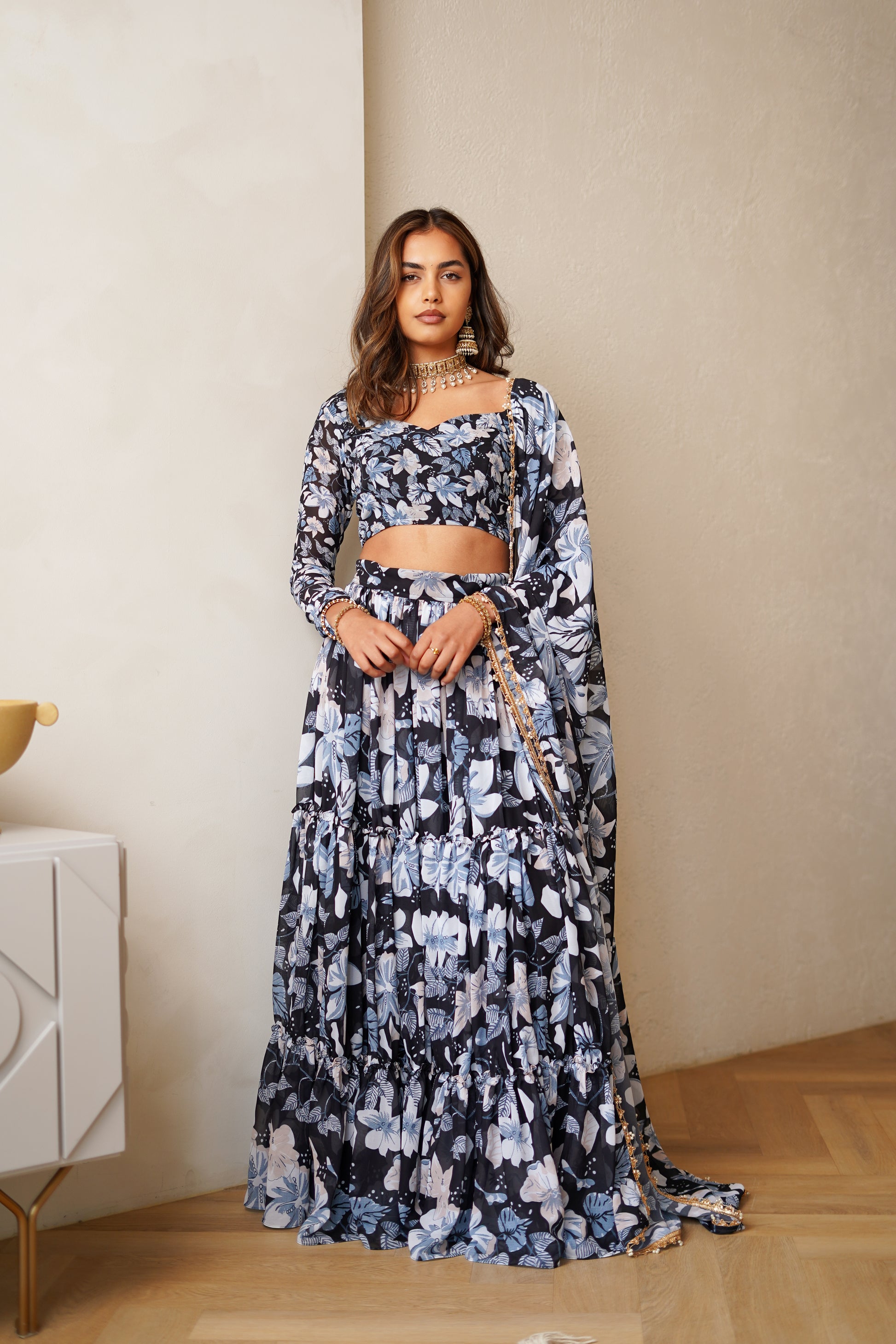 Introducing the Sea Meadow Blouse: a fusion of comfort and elegance in a beautiful georgette fabric. Its full sleeves and sweetheart neckline are complemented by a palette of serene blues, echoing the tranquility of a meadow by the sea. Perfect for pairing with the matching saree or skirt, this blouse boasts elegance and style.