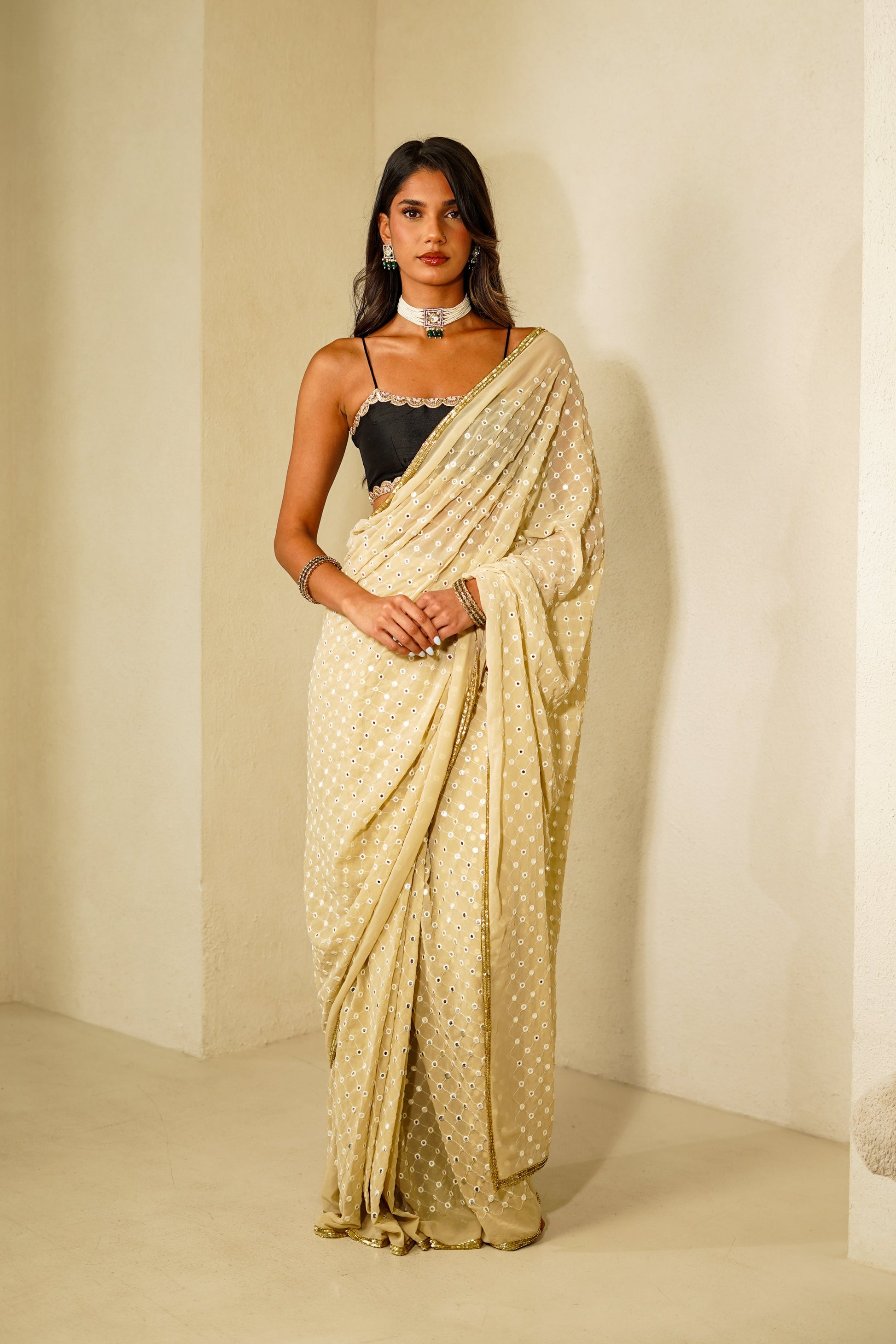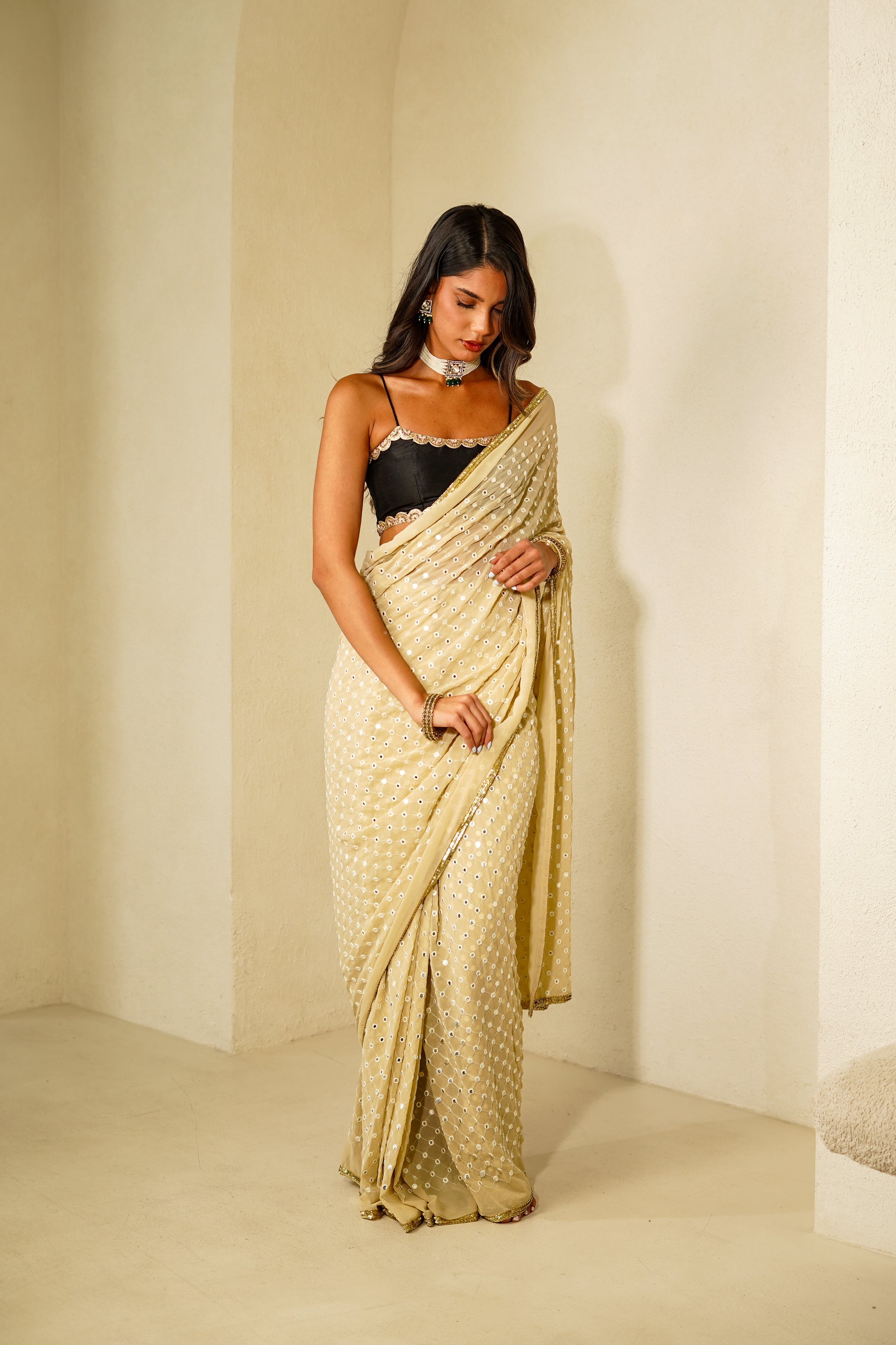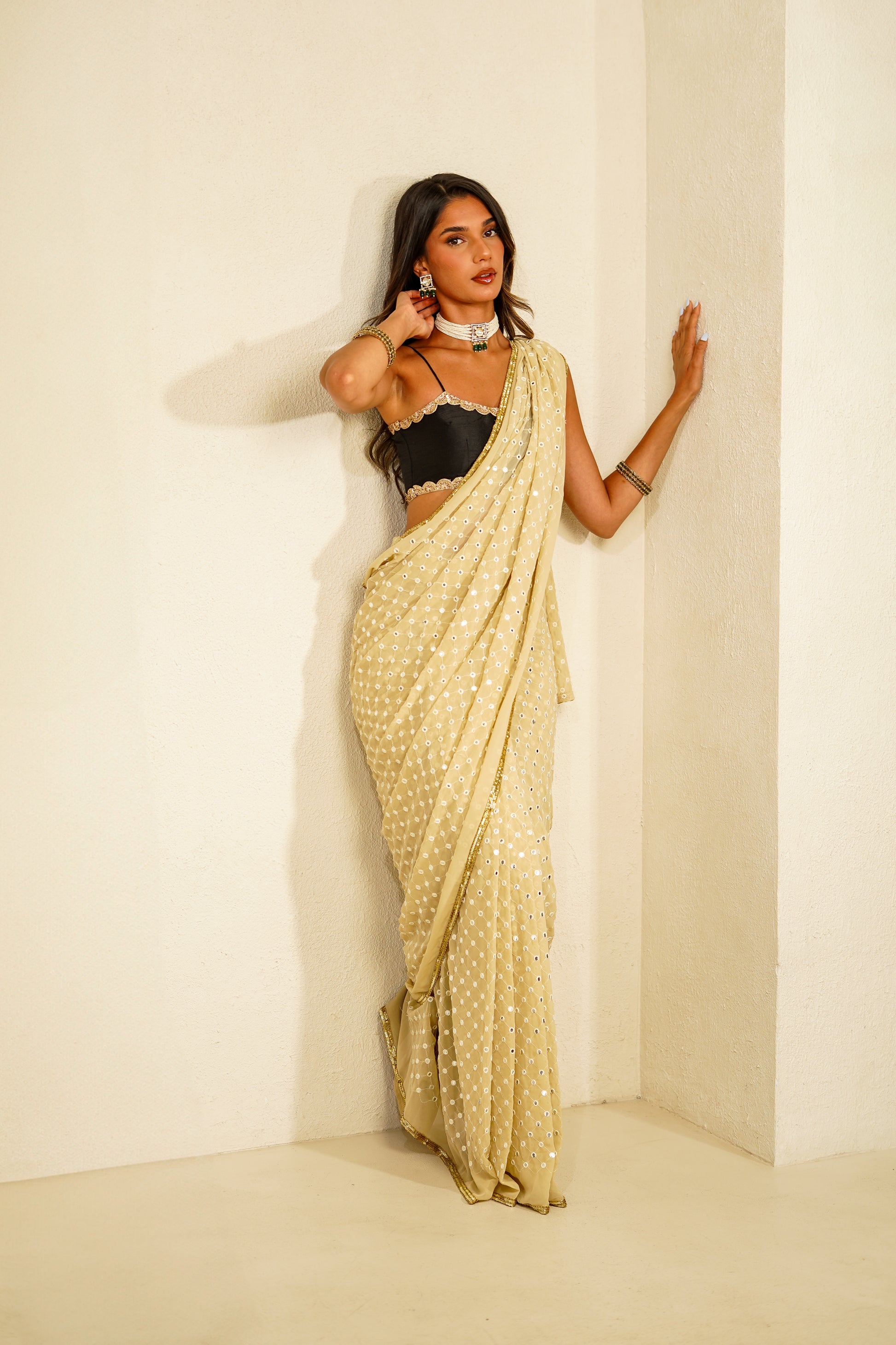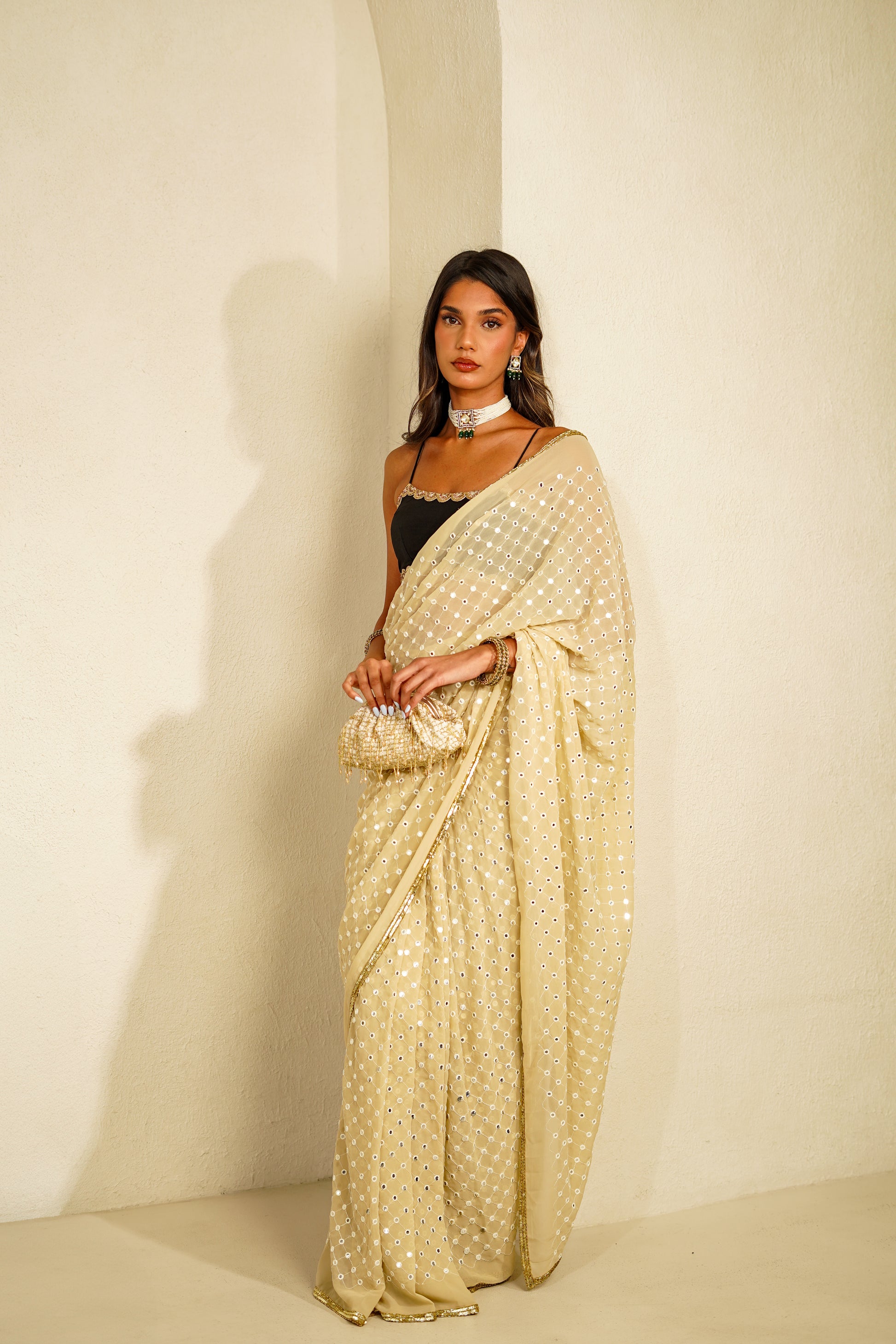 The Sierra Desert Saree is a timeless favorite, back by popular demand after years of being adored by our customers. This stunning mirror-work saree is beautifully complemented by a sequins border that adds just the right amount of sparkle. Crafted from soft, breathable georgette fabric, it drapes gracefully, ensuring comfort without compromising on style. Whether you're attending a special occasion or making a statement at a party, The Sierra Desert Saree promises to leave you feeling classy and effortlessly elegant. A true wardrobe essential that combines tradition and modern allure.